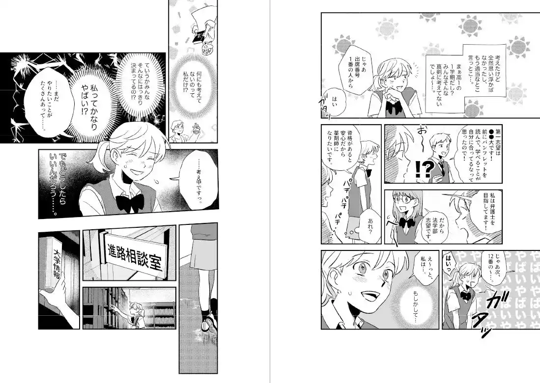 ▲巻頭や各章の頭には漫画が入っていて読みやすい。進路に悩む主人公・遥(はるか)の成長譚。(漫画:宮崎郁) |