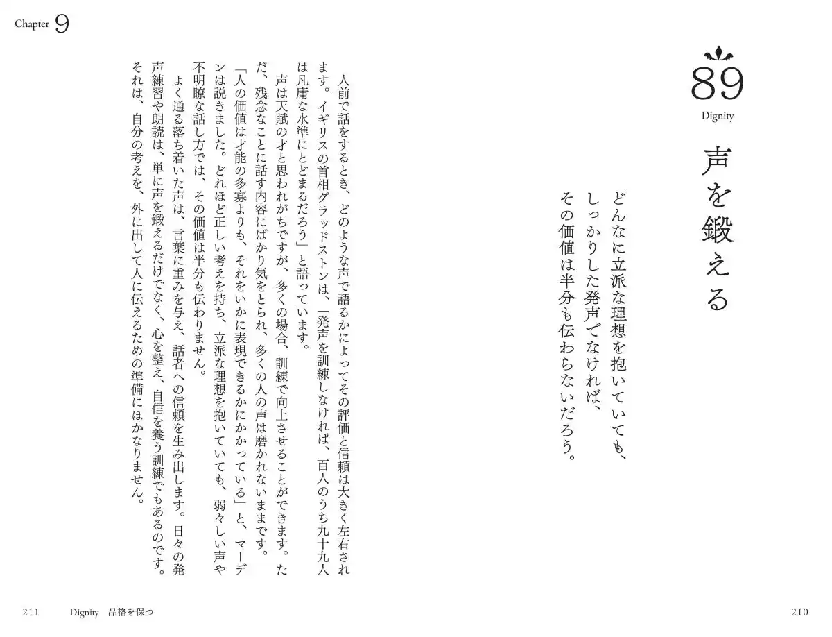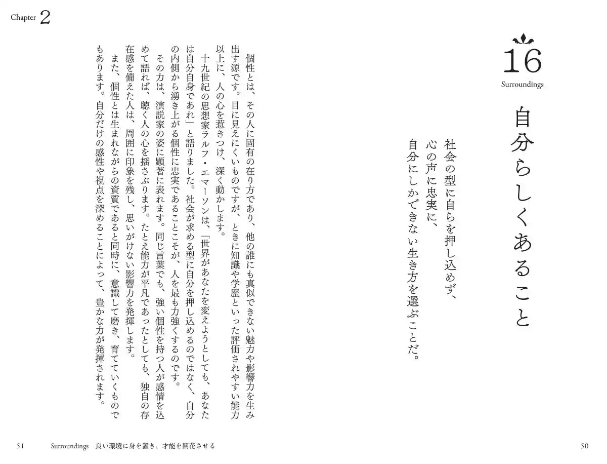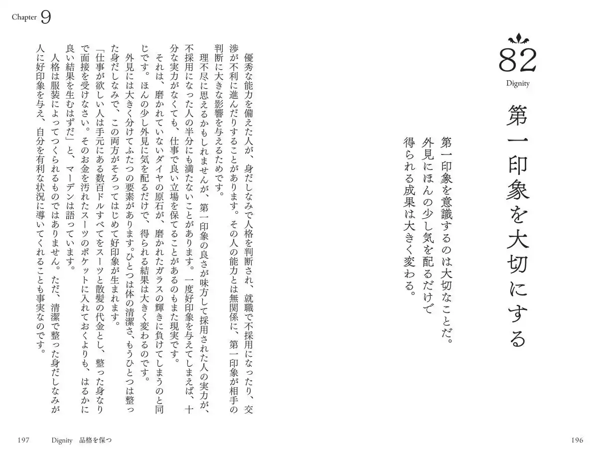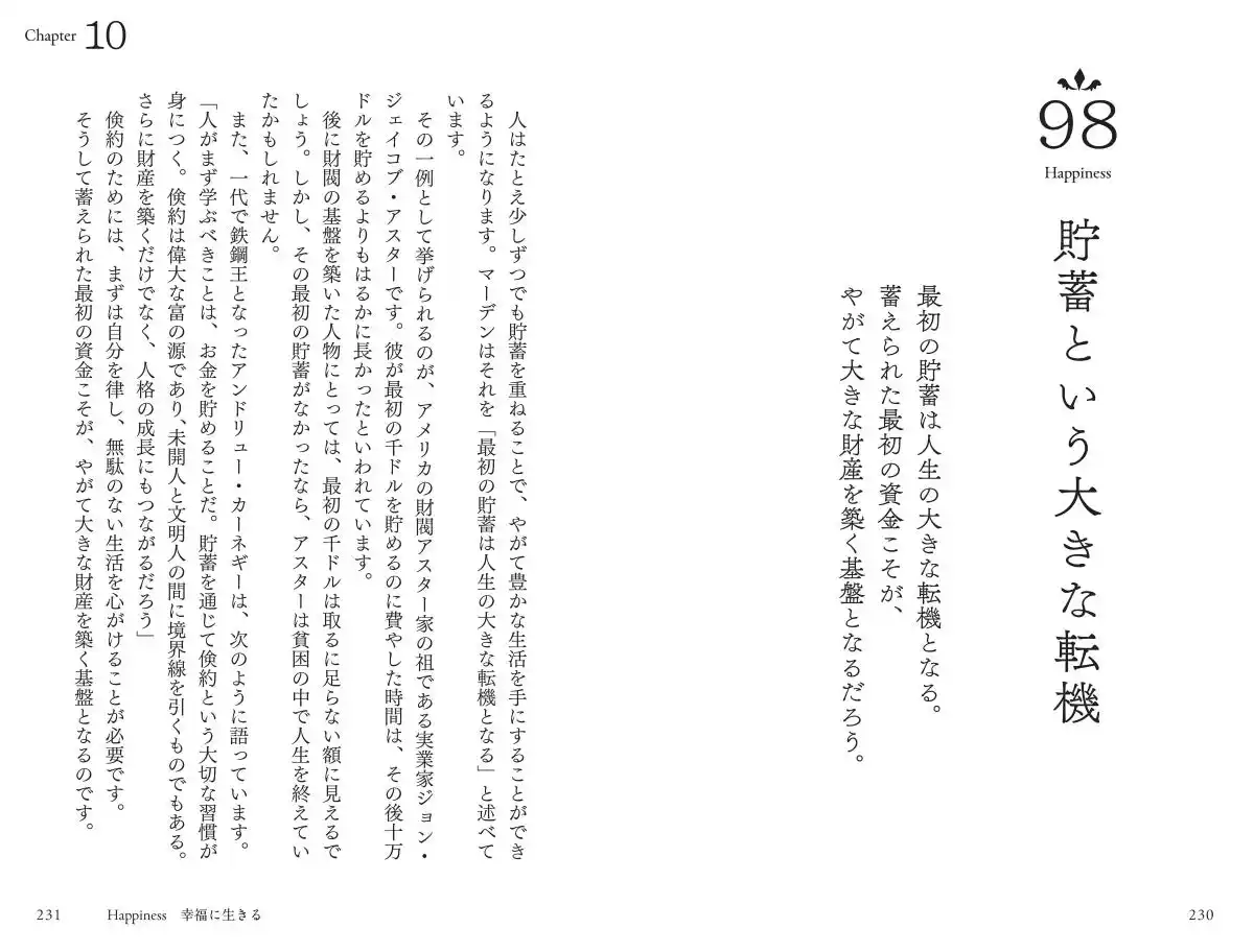Chapter1 夢を実現する Chapter2 良い環境に身を置き、才能を開花させる Chapter3 チャンスをつかむ Chapter4 仕事に情熱を注ぐ Chapter5 強い意志を持つ Chapter6 逆境に打ち勝つ Chapter7 人とつながり、人生を豊かにする Chapter8 自分を磨く Chapter9 品格を保つ Chapter10 幸福に生きる |