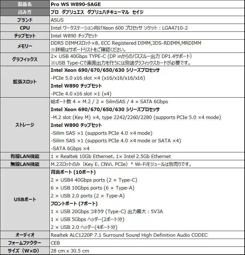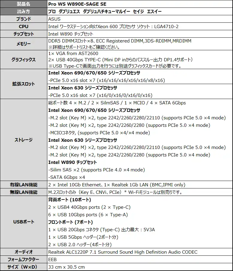ASUS JAPAN株式会社は、AIコンピューティングに最適な、ワークステーション向けIntel Xeon 600プロセッサーに対応した、Intel W890チップセット搭載のワークステーションマザーボード「Pro WS W890E-SAGE SE」および「Pro WS W890-SAGE」を発表しました。2026年4月3日(金)より販売開始します。 |