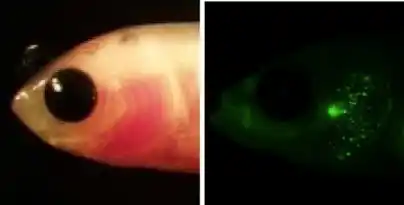 マイクロプラスチック(MP)の影響を調査するため、透明な金魚(Carassius auratus)を用いた曝露実験を実施した。透明な1ヶ月齢の幼魚(図1)に、直径2マイクロメーターの蛍光標識マイクロプラスチックビーズ(FMP)を曝露させ、体内の取り込みを4週間(28日間)追跡した。投与期間中、FMPの局在を追跡するため、毎週、頭部、腹部、尾部の3部位の写真を撮影し、途中で死亡したものは死亡日を記録した。 |