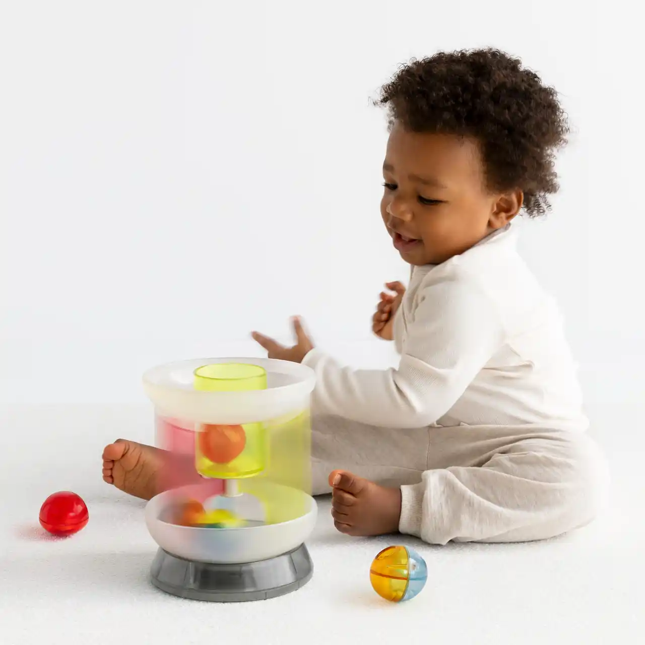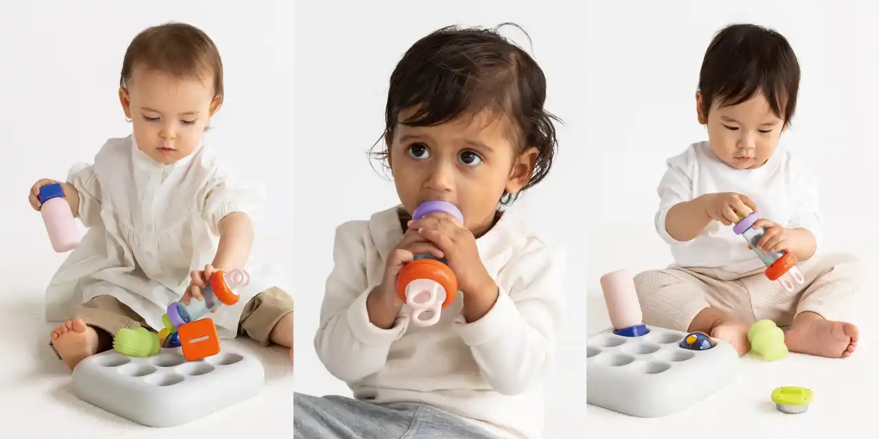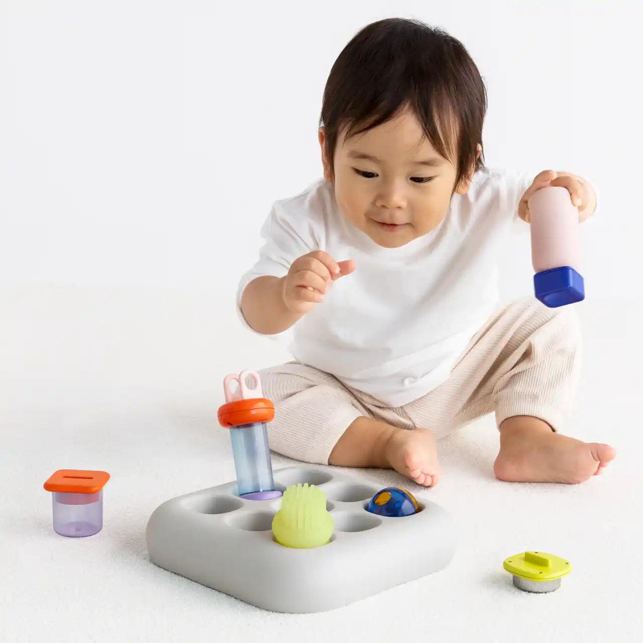 | 一方『1curiosity』は、世界中の1歳が好きなモノとそれに対する行動を観察し、好奇心を引き出すサイズ・重さ・素材・形状といった要素だけを抽出しデザインしています。 | ||||||||||||||