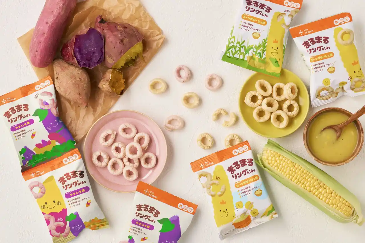 「まるまるリング kids」は、国産米をベースに、野菜のまるごとパウダーを生地に練り込んだリング型のおやつです。採れたてを丸かじりするような素材本来の甘みを感じられる「とうもろこしパウダー」や「安納芋パウダー」を使用し、食材そのもののおいしさを引き出した味わいに仕上げています。 |