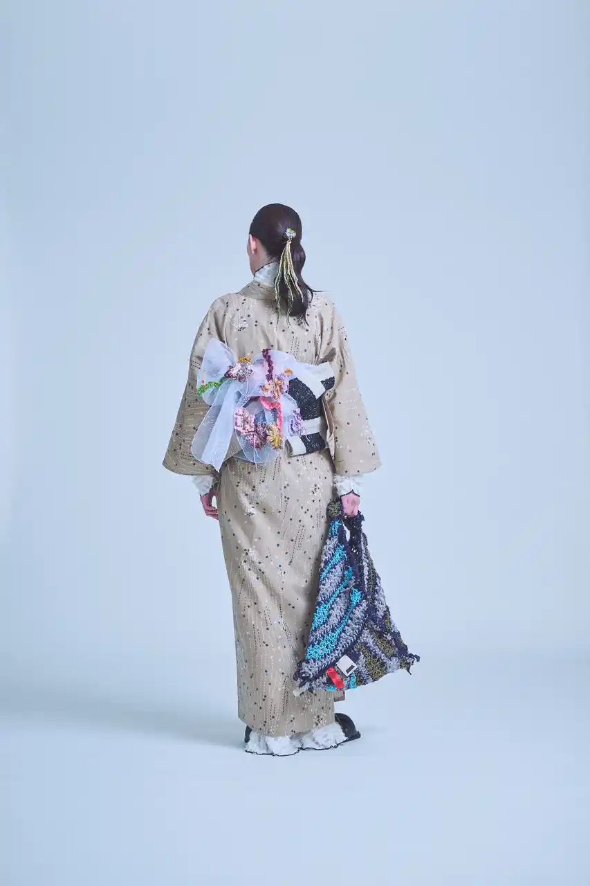直線からなる「きもの」に独自のエッセンスを加えたKIMONO ARCHの生地を、まるで生きているかのような唯一無二のフォルムへとan/eddyが編み上げます。 |