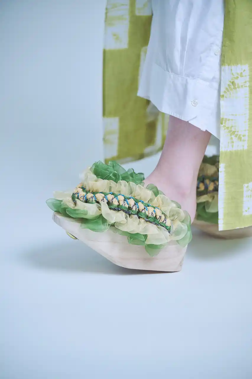 華やかな下駄である「ぽっくり」を採用し、和と洋の感覚を横断するような、存在感のある新たな履物として提案します。 |