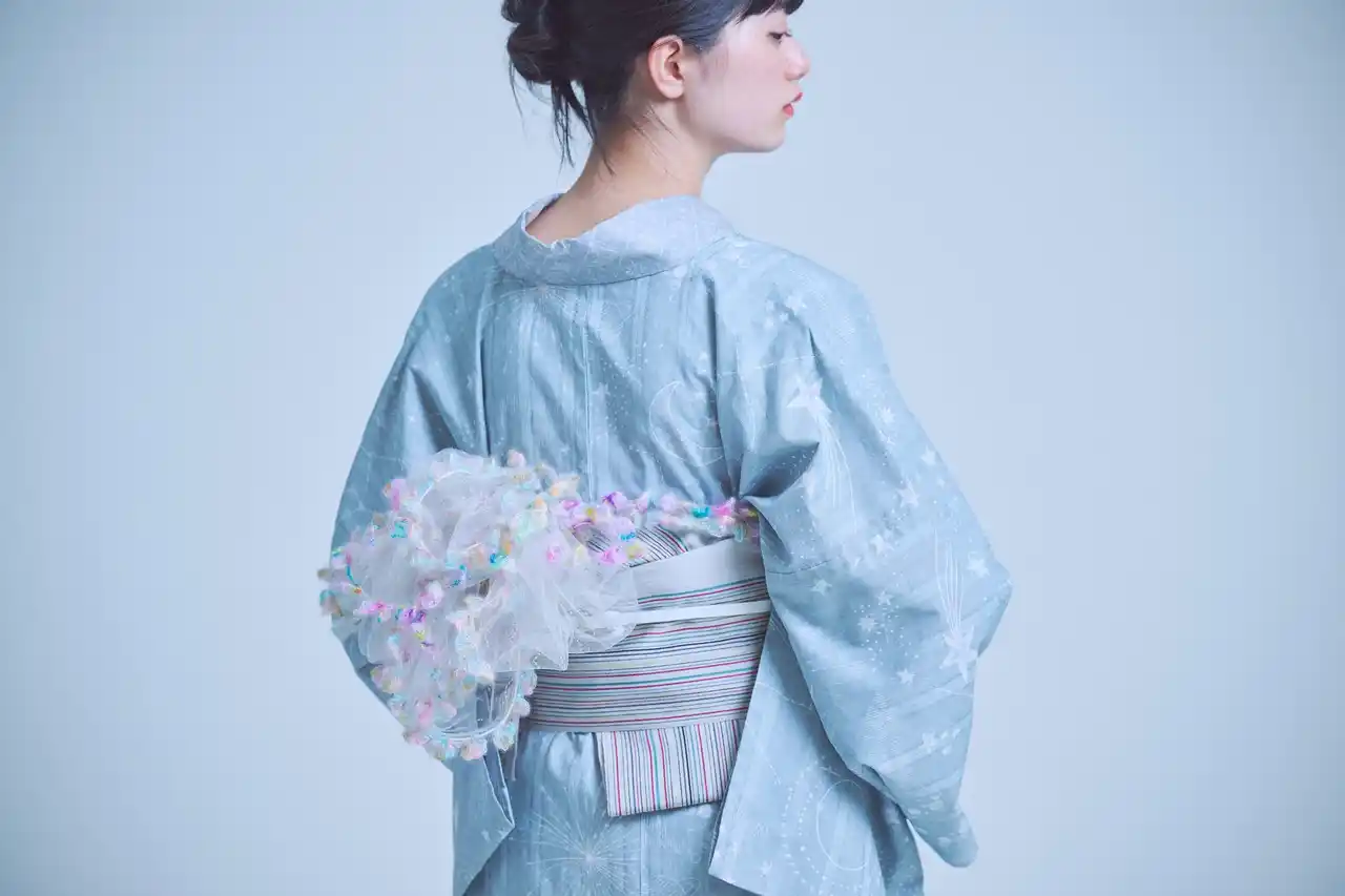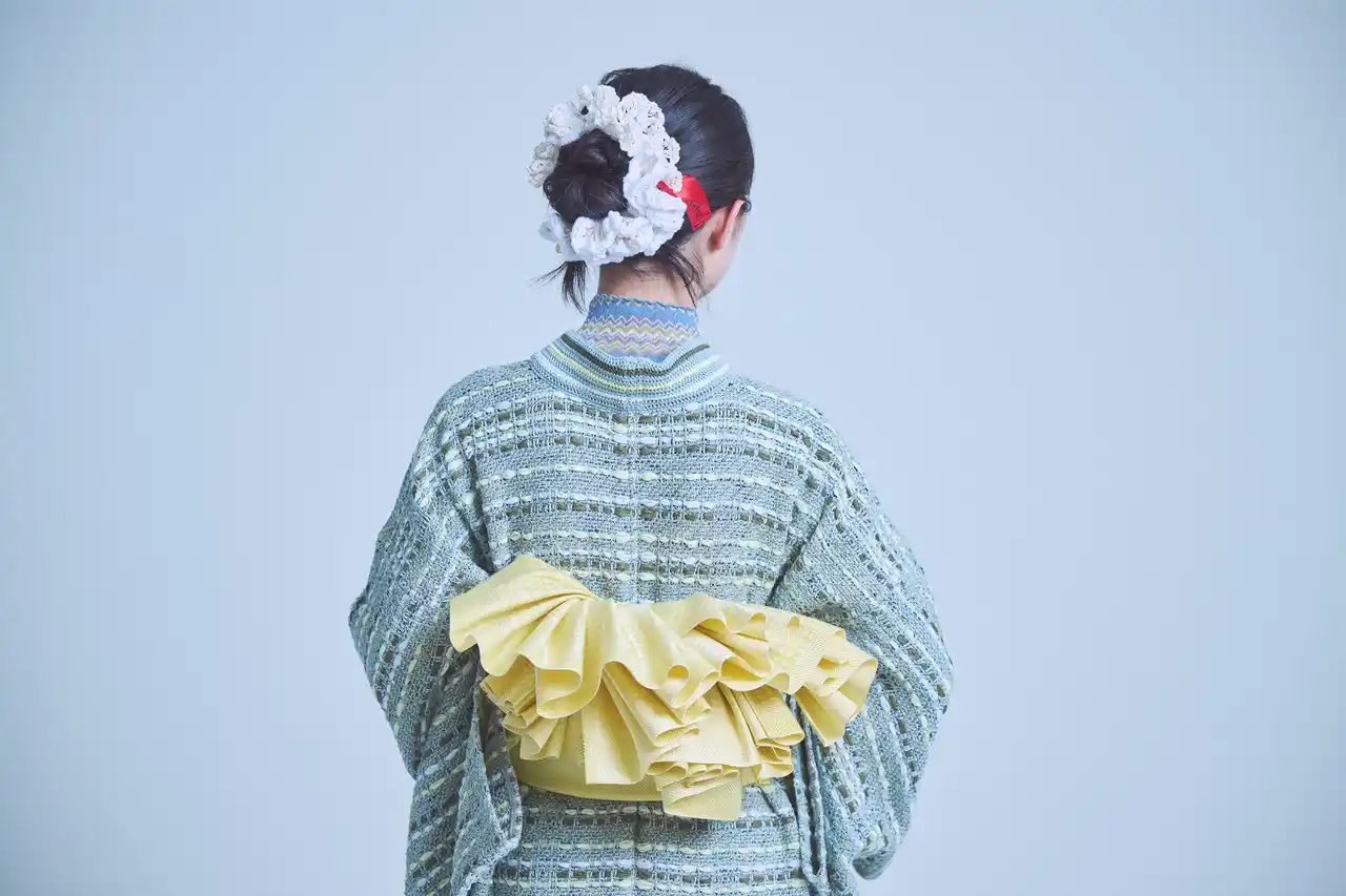 オーガンジーリボンのふんわりとした質感を、さんちの残糸を用いた京組紐で引き締め、厚底の下駄と合わせました。 |