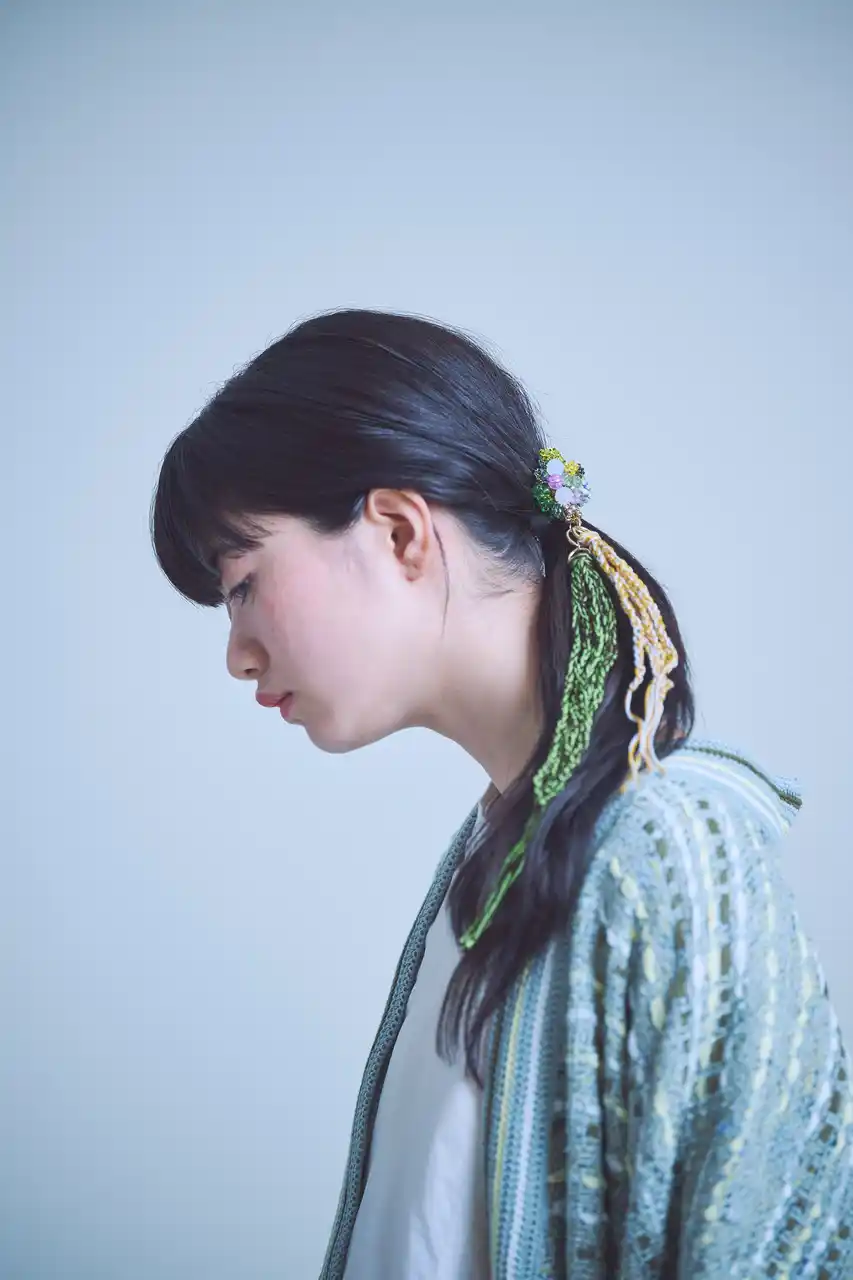 アイルランドにて手染めされた多色の毛糸を、チュールの縁に編みつけることで、軽やかに揺れる動きが魅力の帯飾り。 |