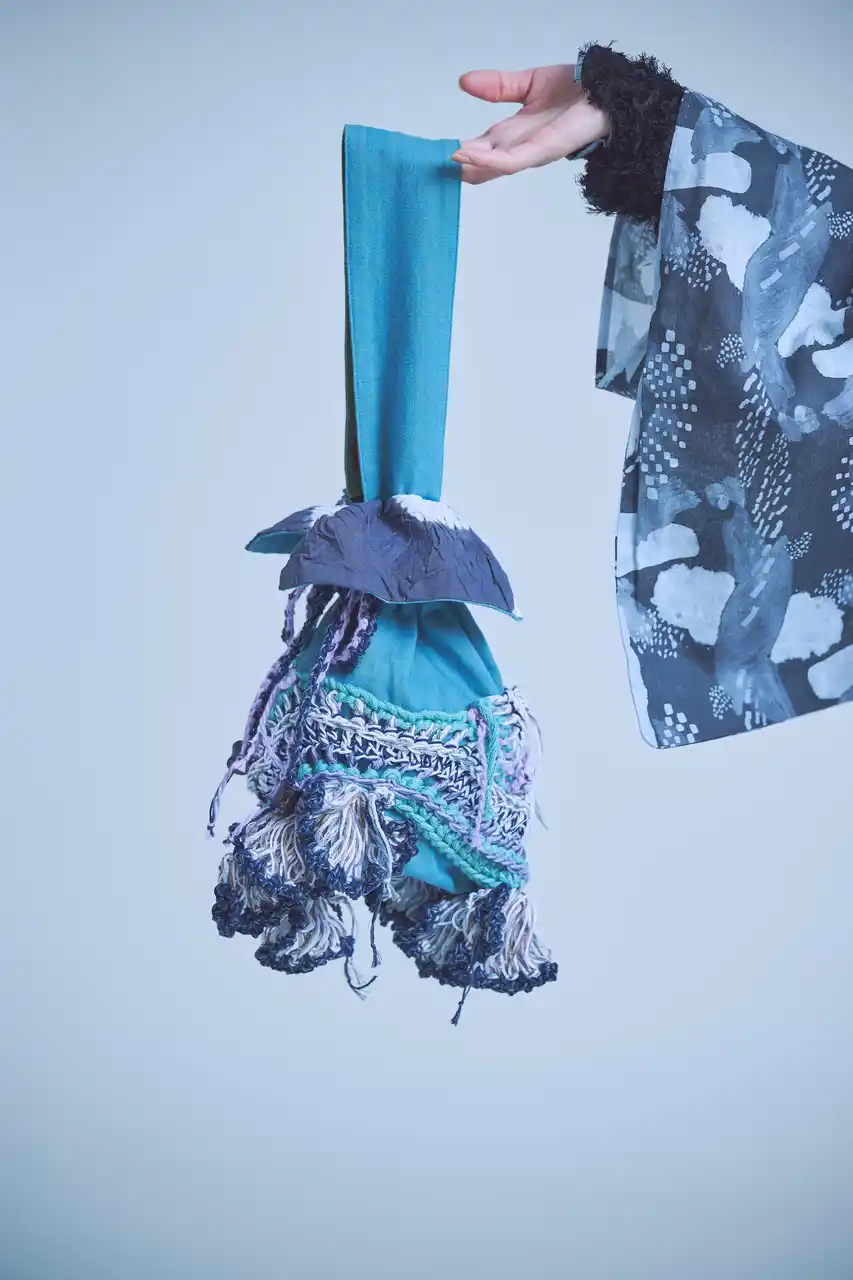 <one handle 巾着> ARCHの片貝木綿と絞りの生地をベースに、an/eddyがコットン糸で立体的な装飾を施したワンハンドル巾着。たぷっとしたふくらみのあるフォルムを引き立てる編みと、袋を閉じる紐の先には、1点ごとに異なる細部の表情が特徴です。ワンハンドル仕様とし、単なる巾着にとどまらない造形に仕上げました。 価格:25,300円(税込) |