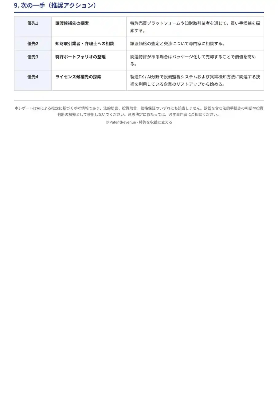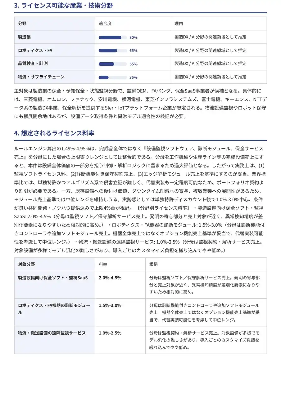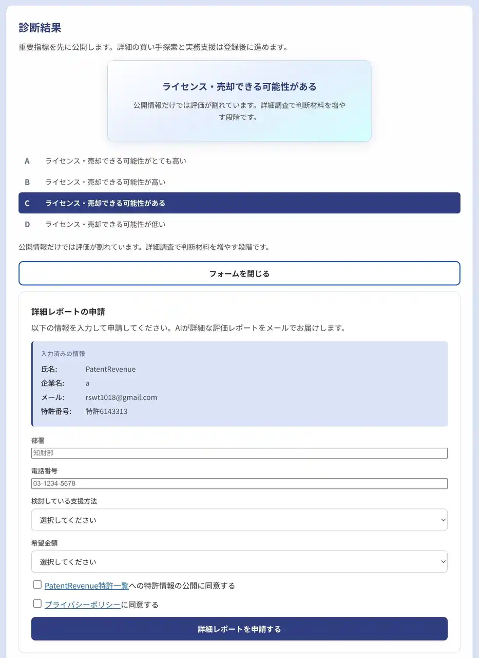 | 本システムは、弁理士監修の独自の評価基準をもとにした価値算定と最適な収益化手段をAIにより自動で提案するものです。 | |||||||||||||||||||