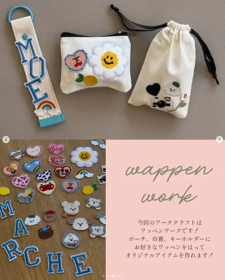 ポーチ・巾着・キーホルダーの好きなアイテムに、豊富なワッペンを自由に組み合わせてオリジナルアイテムをつくれる体験企画(500円~1,000円、事前予約制)。 |