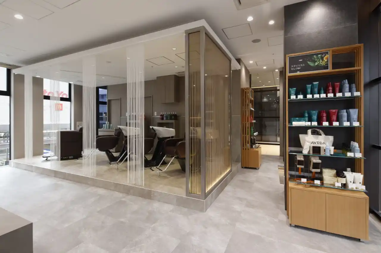 ZELE AVEDA 大井町トラックスは、洗練されたモダンデザインと自然素材の調和が特徴です。 |