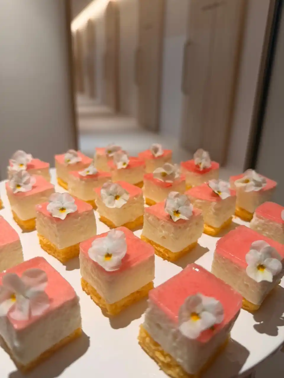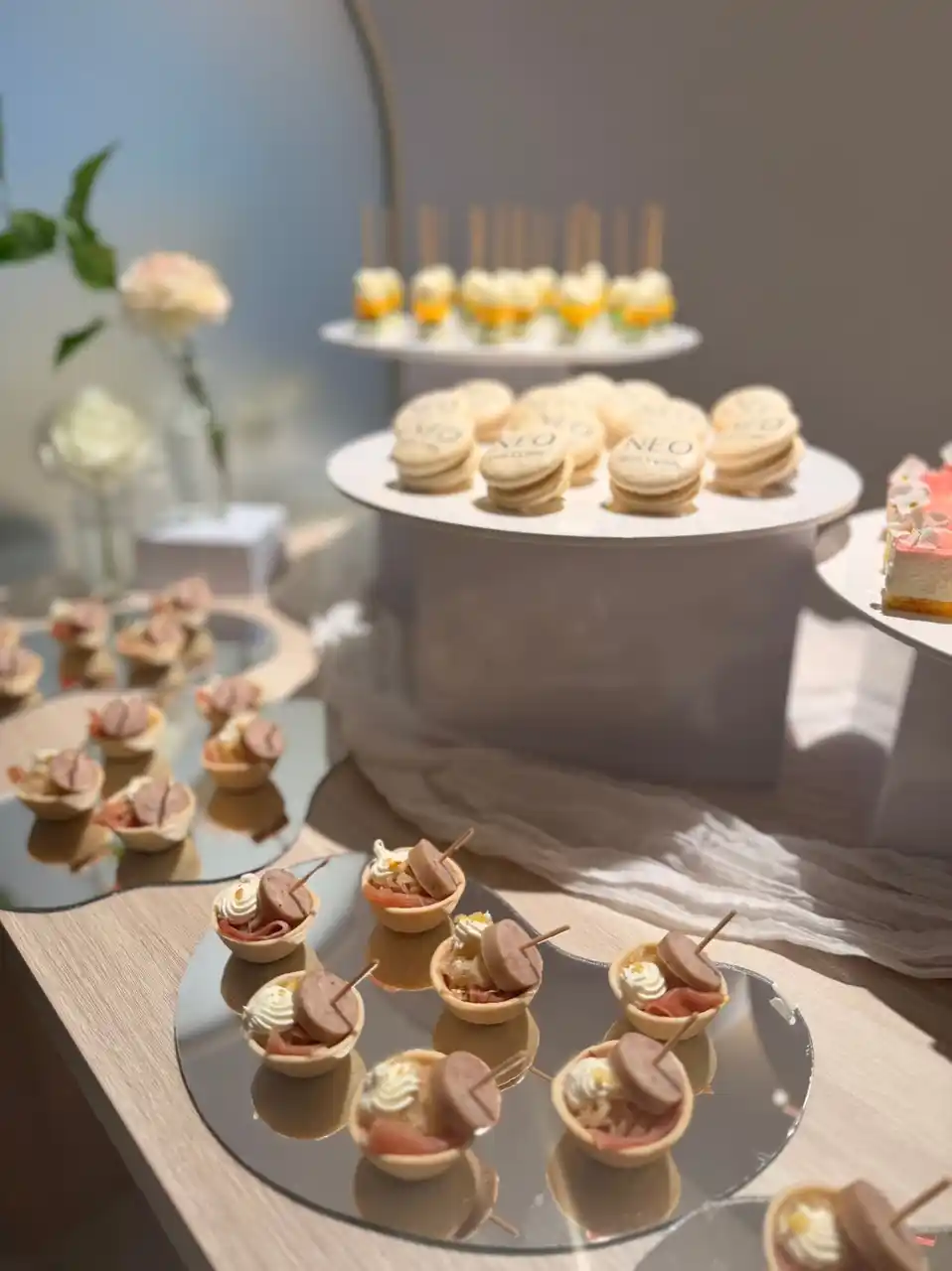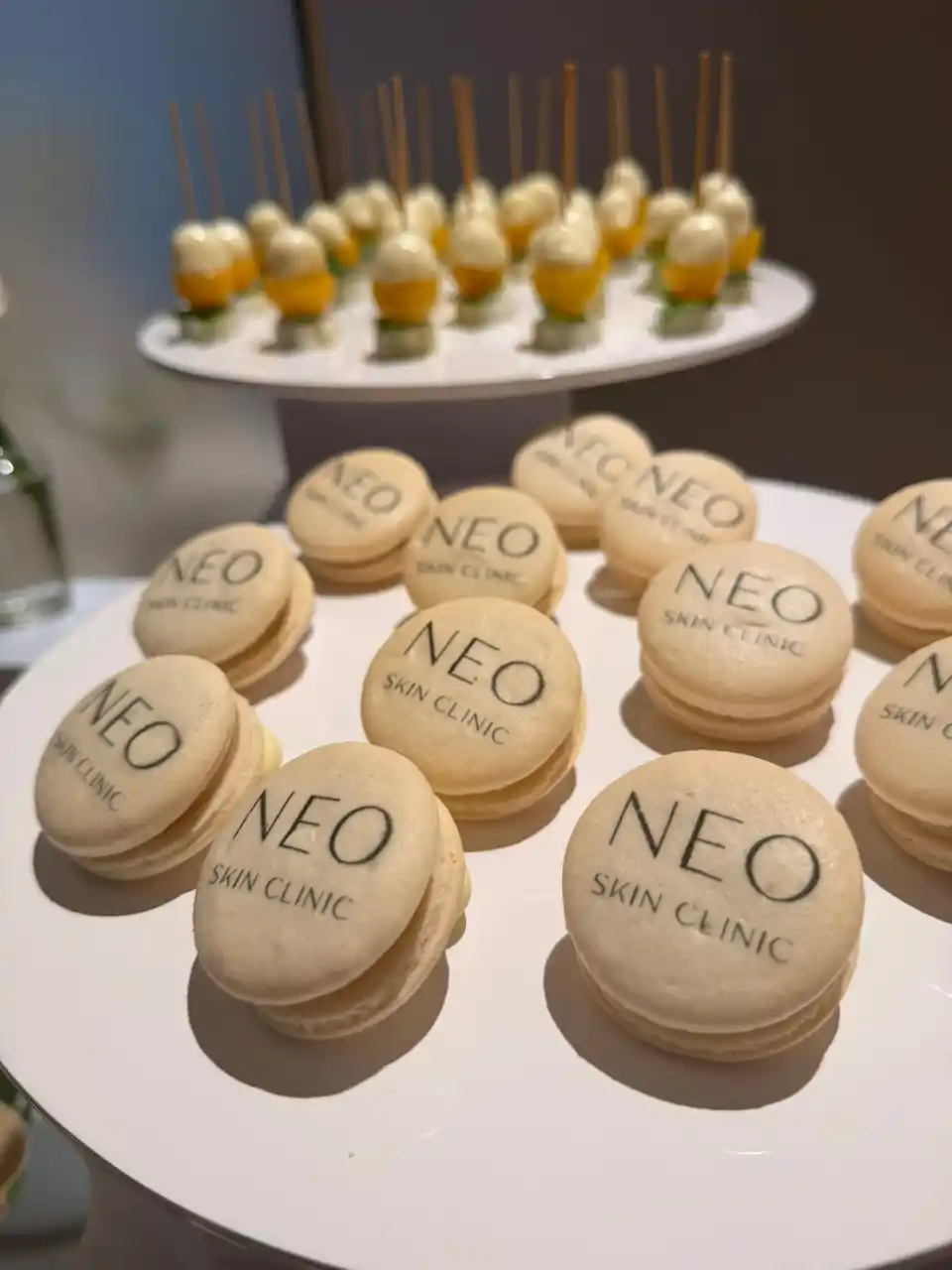 | 院内ツアーの合間には、レセプションならではのおもてなしがゲストを迎えました。ブランドロゴをあしらったマカロン、季節のフルーツを使ったピンチョス、エディブルフラワーを添えたプティガトー、クリームとソーセージのタルトレットなど、華やかなフィンガーフードが会場を彩りました。まもなく訪れる春を感じさせる軽やかな色彩と演出のもと、ホワイト×コーラルピンクの統一感あるスタイリングが、NEO Skin Clinicの世界観を美しく表現しています。 | ||||||||||||||