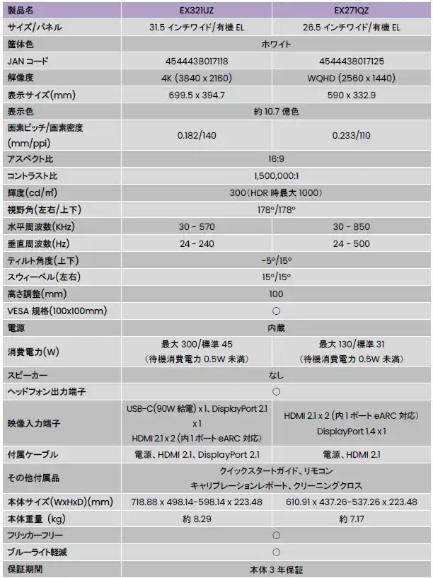 「EX321UZ」「EX271QZ」製品仕様表 |