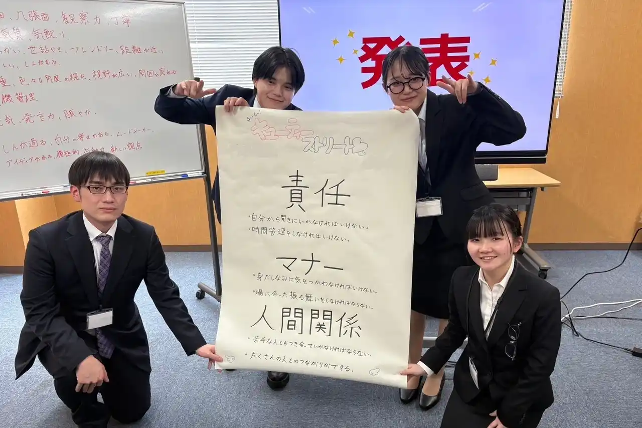 後半では入社式までの研修の振り返りとチームビルディングについて学び、研修の集大成として接客コンテストを行います。 |