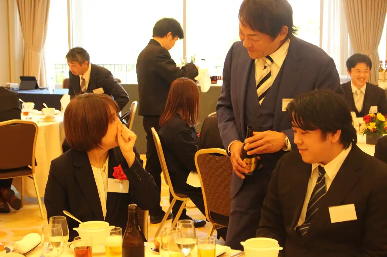 また、入社式後に開催する懇親会(ウェルカムレセプション)では、社長の高橋が各テーブルを回り、ご参加いただいたご家族の皆様と直接交流を図っております。 |