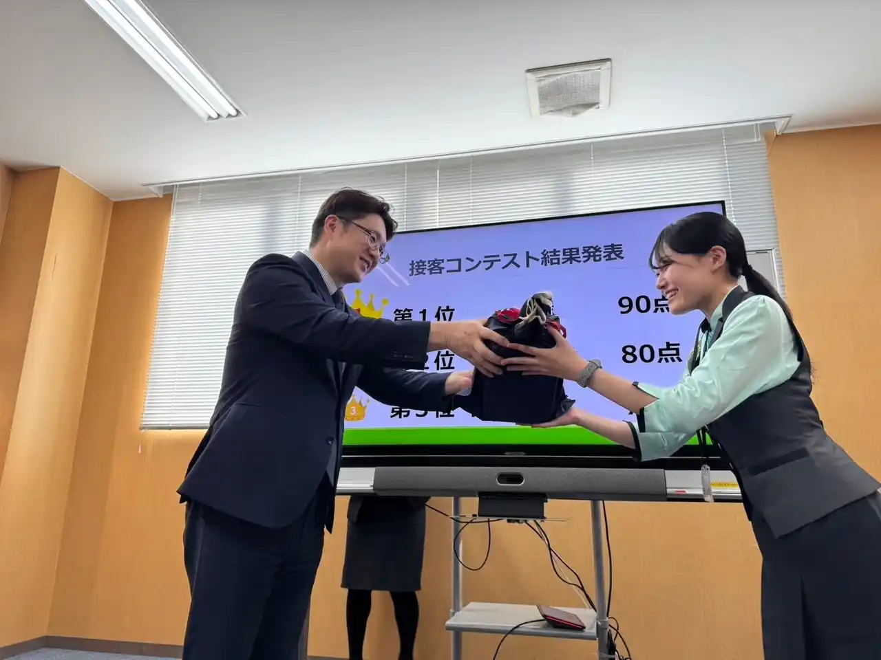 コンテストの内容は、実際の店舗でのシチュエーションを想定したロールプレイングです。今年は、お客様役を採用担当が、審査員を配属エリアのエリア長とトレーナーが担います。 |