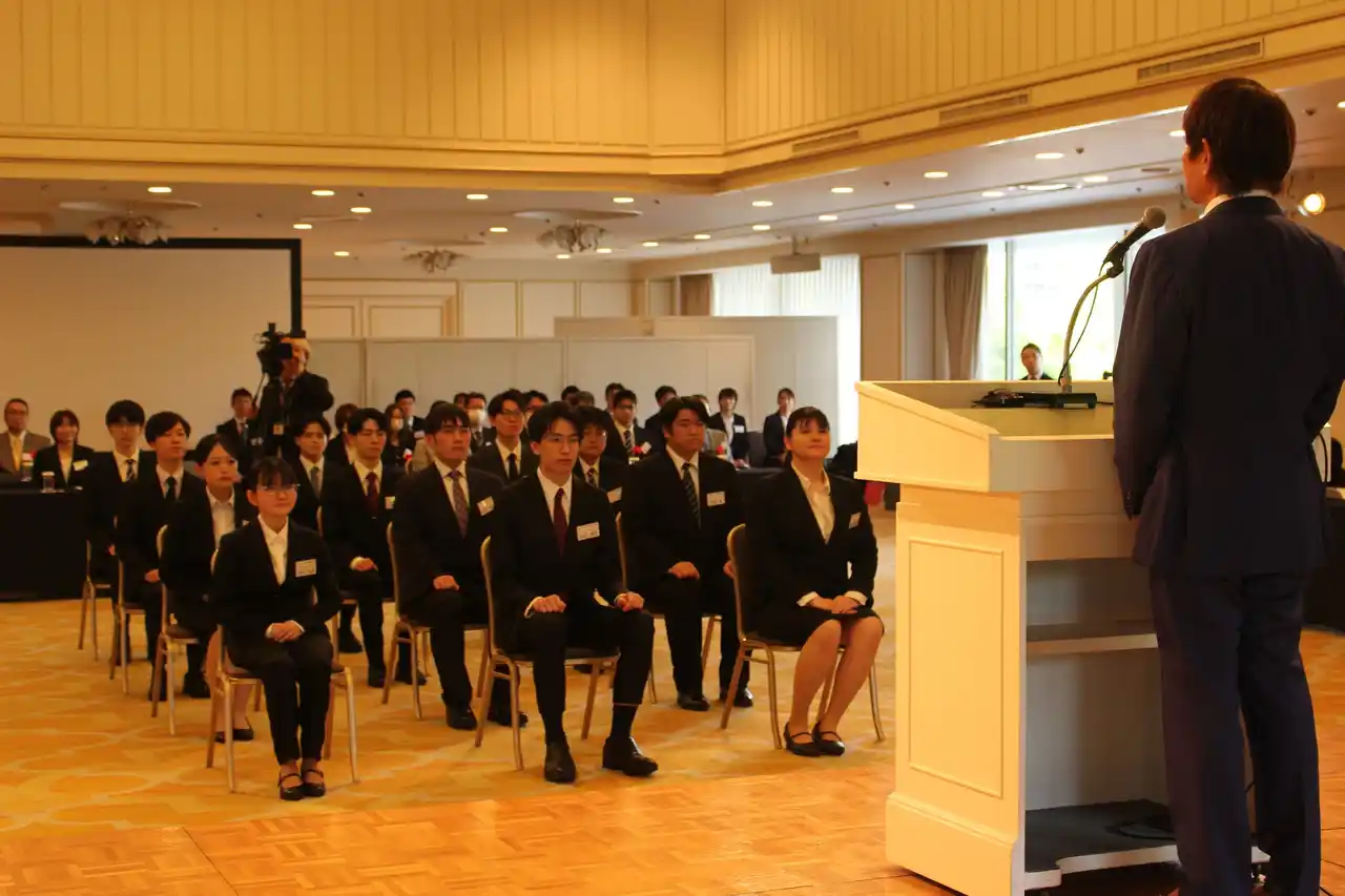 一方で、親御様やご兄弟、ご親戚の方など、ご家族の皆様には当社の取り組みや考えがまだ十分に知られていない部分も多いため、入社式という場を通じて、代表取締役社長の高橋自らがお伝えする機会を設けております。 |