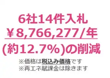 | 坂戸市では、電力価格の高騰に伴う料金体系の複雑化により、従来の入札プロセスでの電力調達業務が難しくなっていましたが、今回リバースオークションを行った結果、計6社から14件の入札があり、再エネ化だけでなくコスト削減も実現することができました。 | ||||