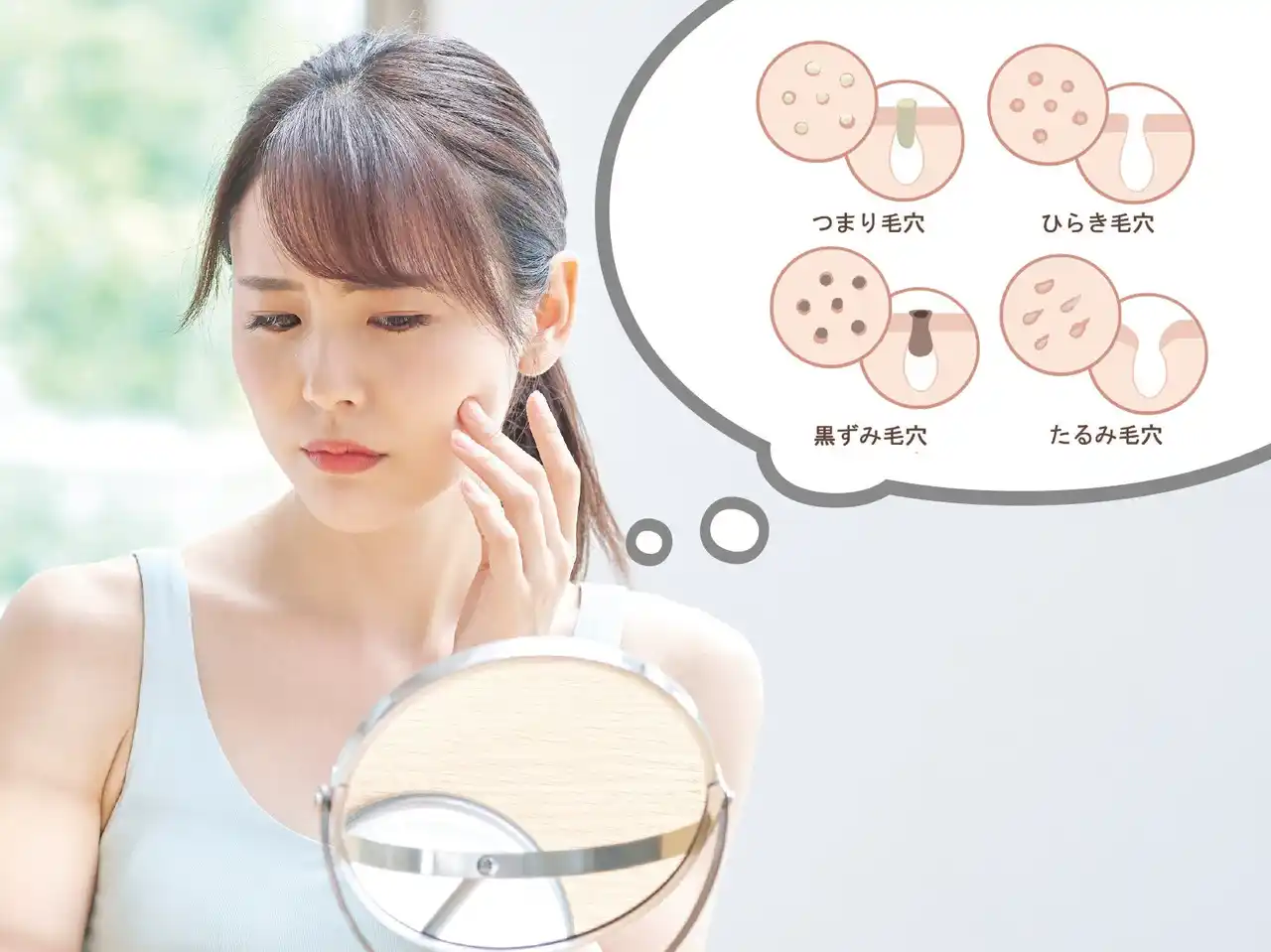 「毛穴悩み」と言っても年齢とともに変化します。例えば、20~30代ですと過剰に皮脂が分泌された「開き毛穴」が増えます。一方で加齢とともに、たるみが出てくることによって、毛穴が楕円形になり大きく見える「たるみ毛穴」が増えていきます。 |