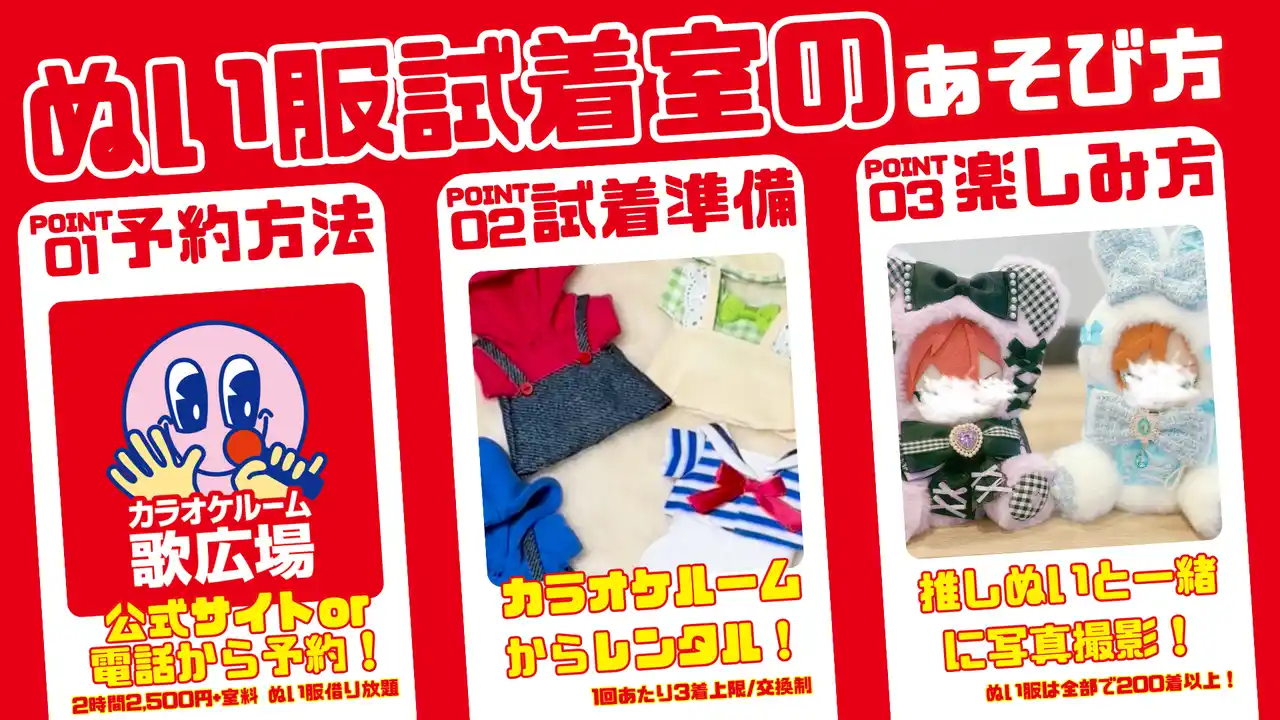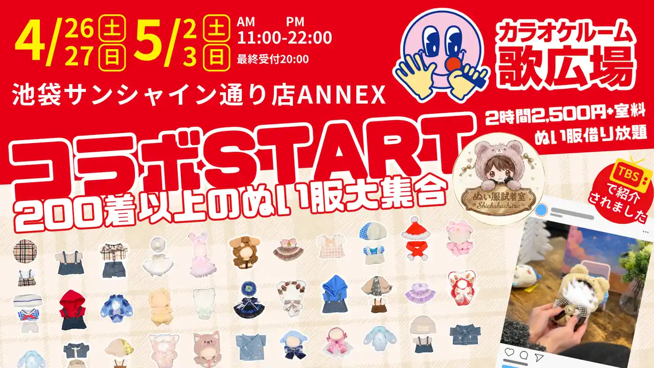 2026年4月25日(土)・26日(日)、5月2日(土)・3日(日)の4日間限定で、歌広場「池袋サンシャイン通り店ANNEX」にて「ぬい服試着室」を開催いたします。 |