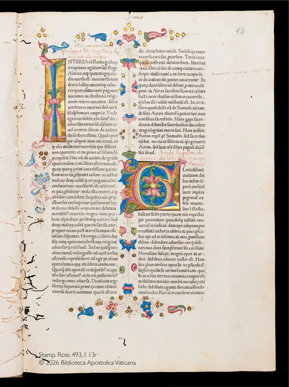 アウグスティヌス 『神の国』 1467年 ヴァチカン教皇庁図書館蔵 Stamp. Ross. 493, f. 13r (C)2026 Biblioteca Apostolica Vaticana |