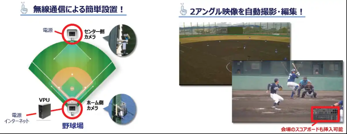 | 今回の配信では、オンラインでのライブ視聴に加え、上富田スポーツセンター野球場内にモニターを設置いたします。 来場したファンは、目の前で繰り広げられる生の迫力に加え、AIカメラが捉えたピッチャーの表情やバッターのスイング、際どいプレーのズーム映像などをモニターで同時に楽しむことができます。デジタル技術を融合させることで、現地観戦の価値をさらに高める新たな観戦スタイルを提案します。 | ||||||||||