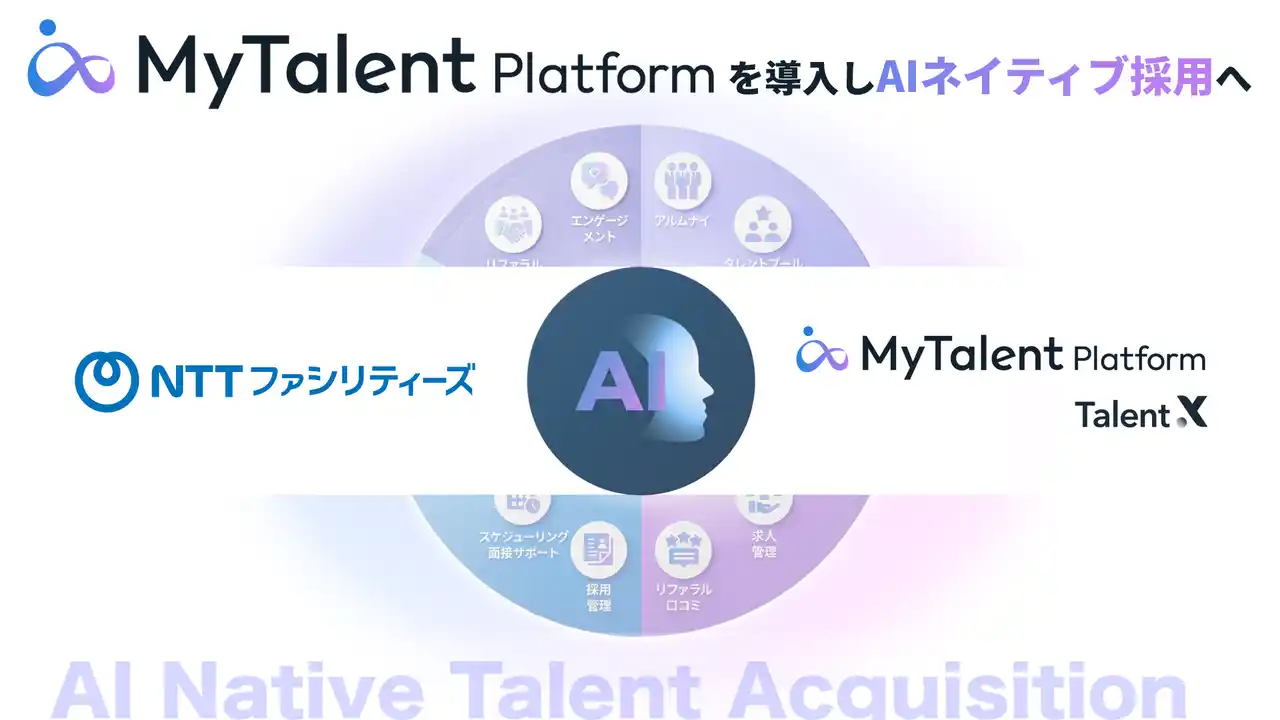 株式会社TalentX(本社:東京都新宿区、代表取締役社長CEO:鈴木 貴史、証券コード:330A、以下「TalentX」)は、株式会社NTTファシリティーズ(本社:東京都港区、代表取締役社長:川口 晋、以下「NTTファシリティーズ」)が統合型タレントアクイジションプラットフォーム「MyTalent Platform」内のAIネイティブ採用CRM「MyTalent CRM」を導入し、カムバック(アルムナイ)採用およびキャリア登録制度の運用を開始したことをお知らせいたします。 |