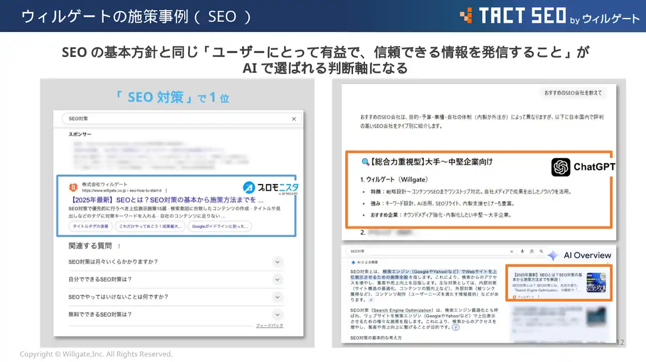 ウィルゲートは21期目を迎え、累計7,000社以上のSEOコンサルティング実績を持つ国内トップクラスの企業です。弊社が推奨するSEOで実績を出すためのコツは、単にAIに文章を書かせるのではなく、文章を書く前の「分析」にあります。 |