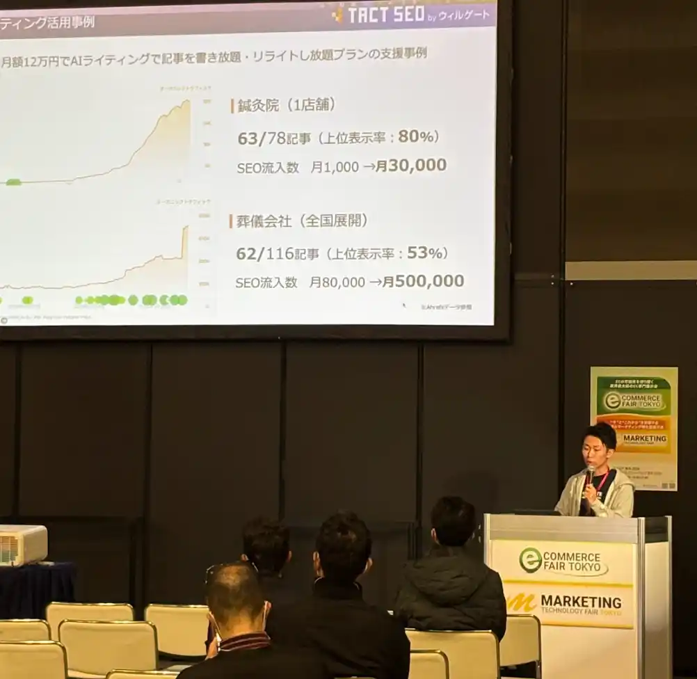 SEOを中心としたWebマーケティング支援を行う株式会社ウィルゲート(本社:東京都港区、代表取締役:小島 梨揮、以下ウィルゲート)は、2026年2月26日(木)に開催された展示会「マーケティング・テクノロジーフェア 東京 2026」にてセミナーに登壇しました。 本イベントでは、1日目は2,000名以上の来場者が訪れた中、生成AIを活用したSEOツール「TACT SEO」のコンテンツマーケティング手法をテーマに、記事作成工数やコスト削減をできるコンテンツマーケティングの実践的なノウハウを解説しました。 |