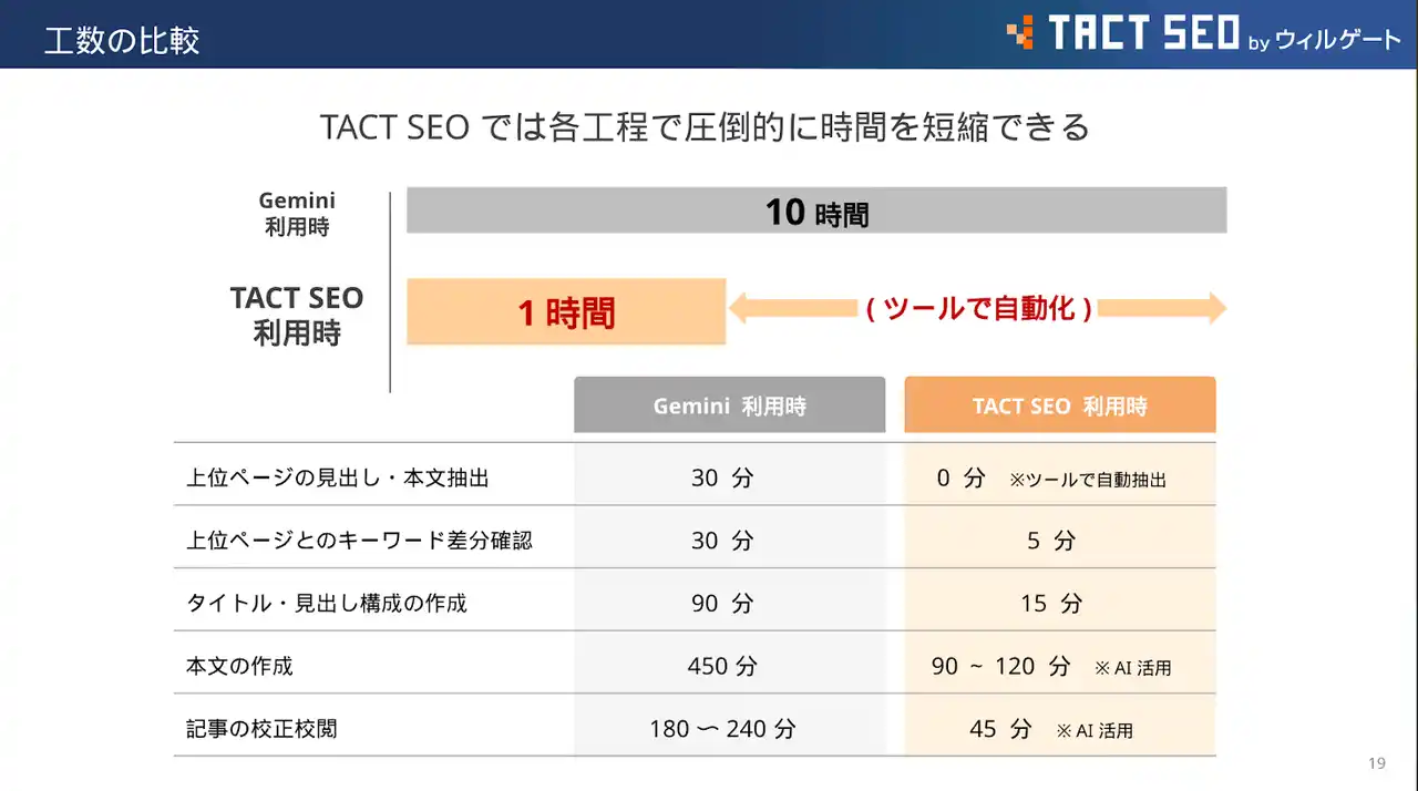 例えば、従来はリサーチから執筆まで1記事あたり約10時間かかっていた作業が、本ツールを使えばわずか約1時間に短縮可能です。 |