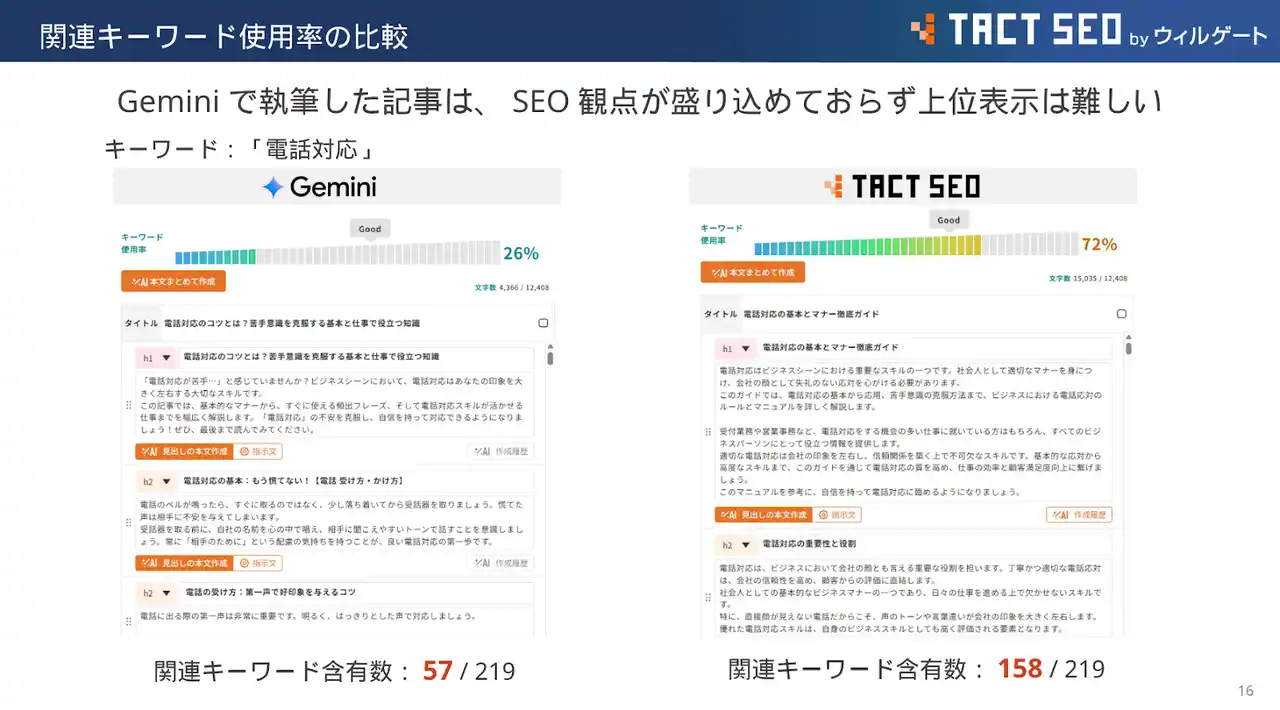 汎用AIに単に指示を出すだけではSEOに必要なキーワードが不足しがちですが、『TACT SEO』は上位ページの要件を自動で分析して記事を生成するため、本文中の重要キーワードの含有率が通常のAIの倍近くに達します。 |