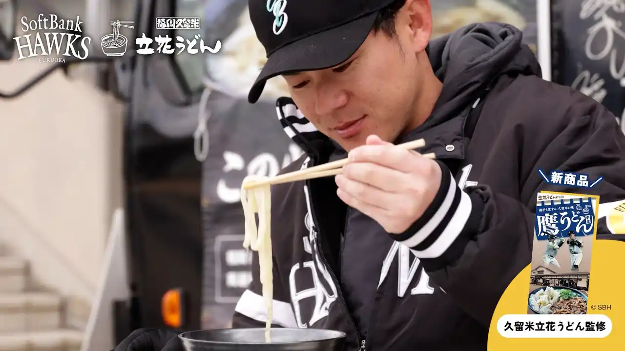 また、牧原大成選手と柳田悠岐選手が「鷹うどん」を試食する特別動画も当社にて制作しました。本動画は、球場店舗サイネージのほか、球団公式サイトおよびSNSにて公開予定です。 なお「鷹うどん」は、HAWKS STORE HOMEおよび久留米立花うどん店舗にて販売いたします。 |