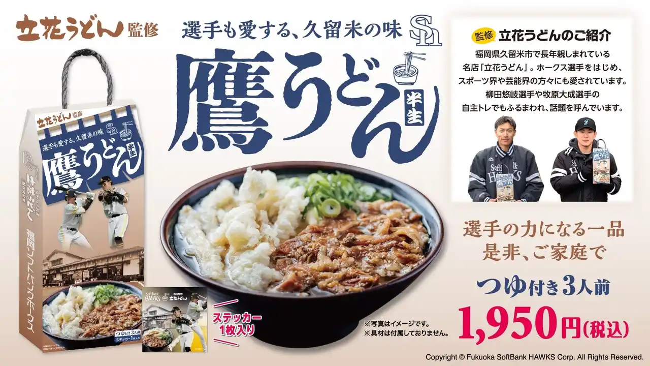 牧原選手、柳田選手も愛する「立花うどん」が監修。発売を記念し若鷹ガチャに「鷹うどんver.」も登場