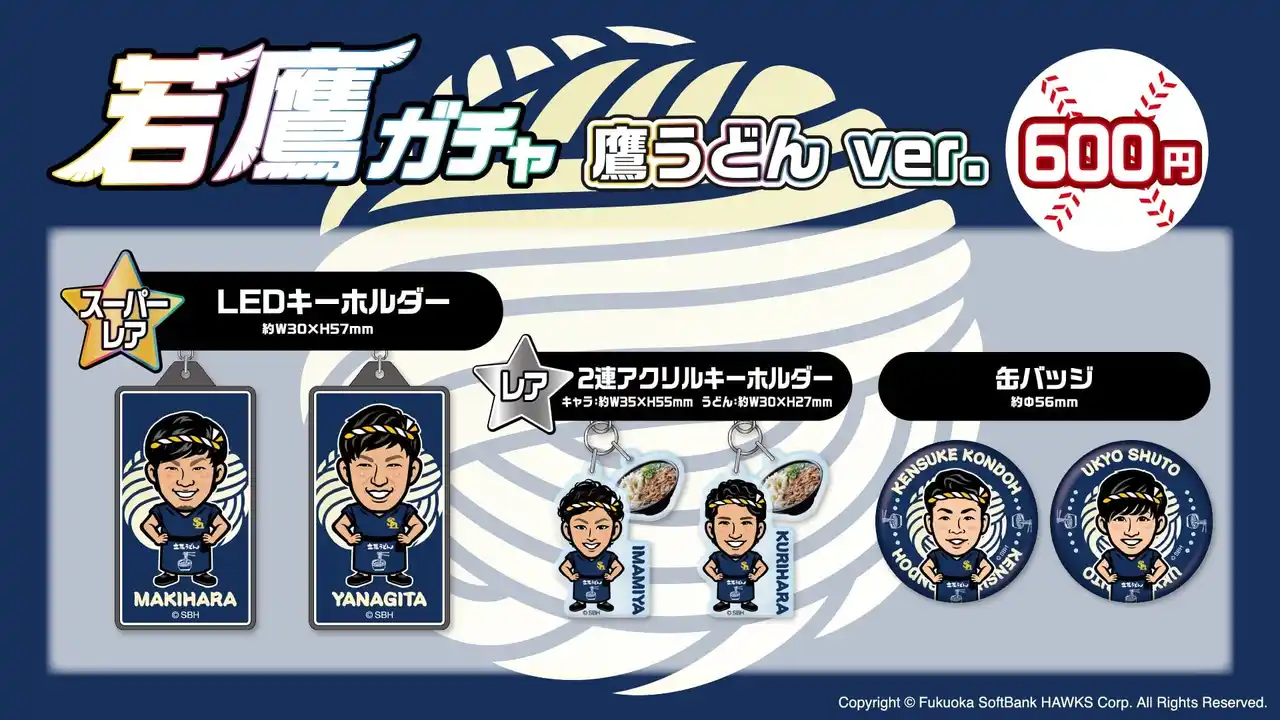 「鷹うどん」の発売を記念し、今回限定のカプセルトイ「若鷹ガチャ 鷹うどんver.」も登場します。うどん店の店主をイメージしたユニフォームやハチマキ姿の選手たちをデザインした限定仕様です。缶バッジをはじめ、レアアイテム「2連アクリルキーホルダー」とスーパーレアアイテム「LEDキーホルダー」の商品を展開し、何が当たるかはお楽しみというカプセルトイならではのワクワク感をお楽しみにいただけます。 |