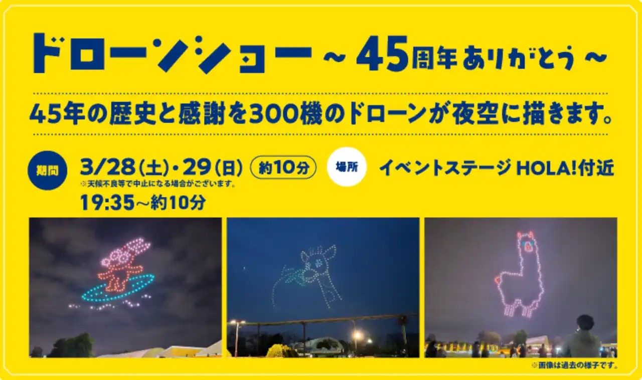 | ドローンショーの企画・演出・運用を一気通貫で提供する手がける株式会社White Crow(新大阪事務所:大阪府大阪市淀川区、代表取締役:堀内 亜弥)は、東武動物公園の開園45周年記念ドローンショー「ドローンショー~45周年ありがとう~」の企画・演出・運用を担当します。開催は2026年3月28日(土)・29日(日)の2日間限定。300機のドローンが夜空を彩り、来園者への感謝と45年の歩みを光のアニメーションで表現します。 | |||