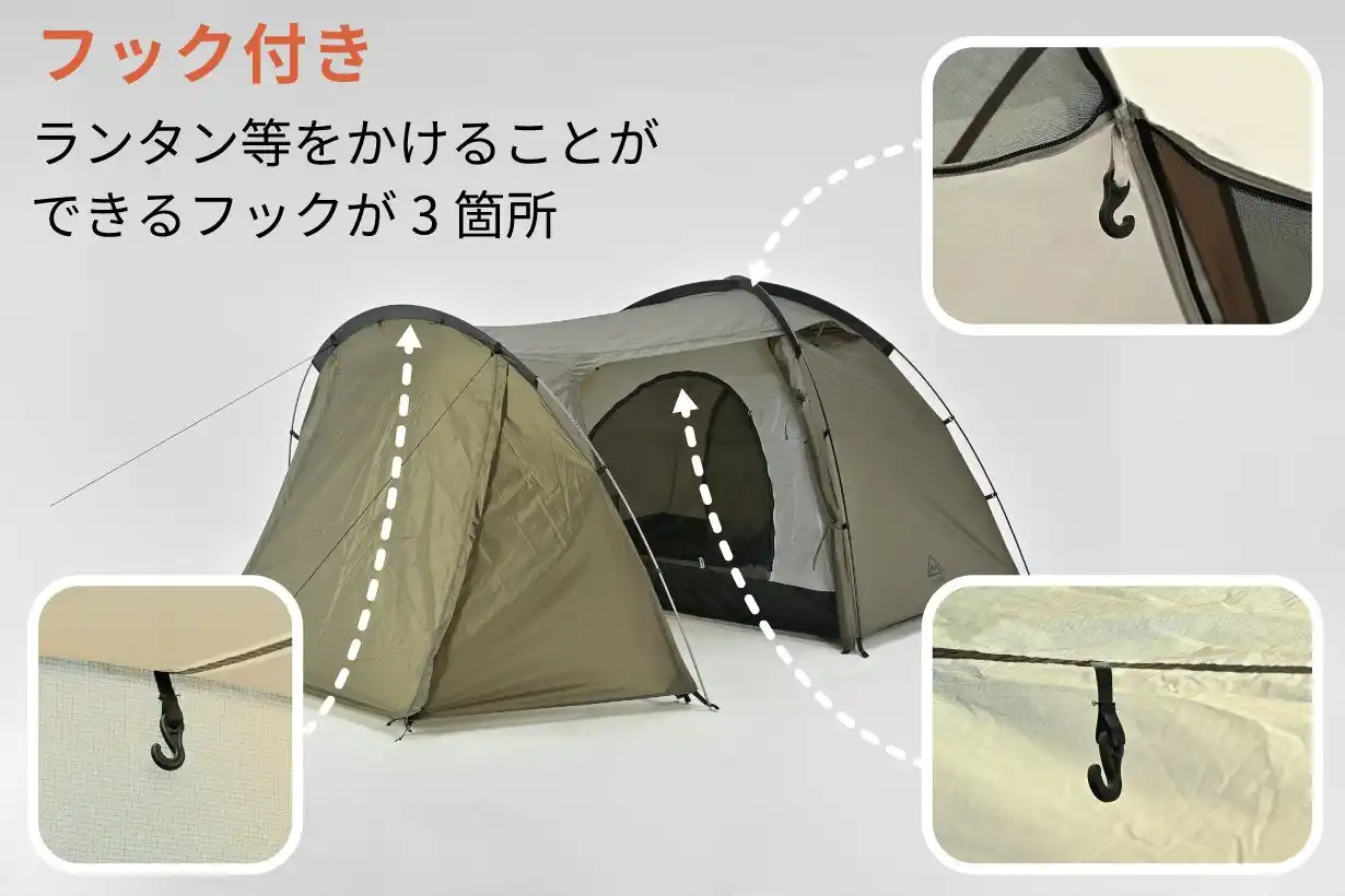 テント内の3箇所にランタンフックを配置しました。メイン照明で室内全体を明るく照らすのはもちろん、就寝前の読書には枕元、着替えや荷物整理には足元など、用途に合わせて最適なライティングが選べます。複数の明かりを組み合わせることで、夜のテント内をより温かみのあるリラックスした雰囲気に演出できるのも嬉しいポイントです。 |