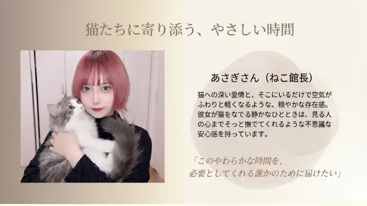 | 猫とともに流れるやわらかな空気と、あさぎさんの対話を通じて、張りつめた心を少しゆるめ、明日へ向かう力を取り戻す。それが本サービスの提供価値です。 | ||||||||||