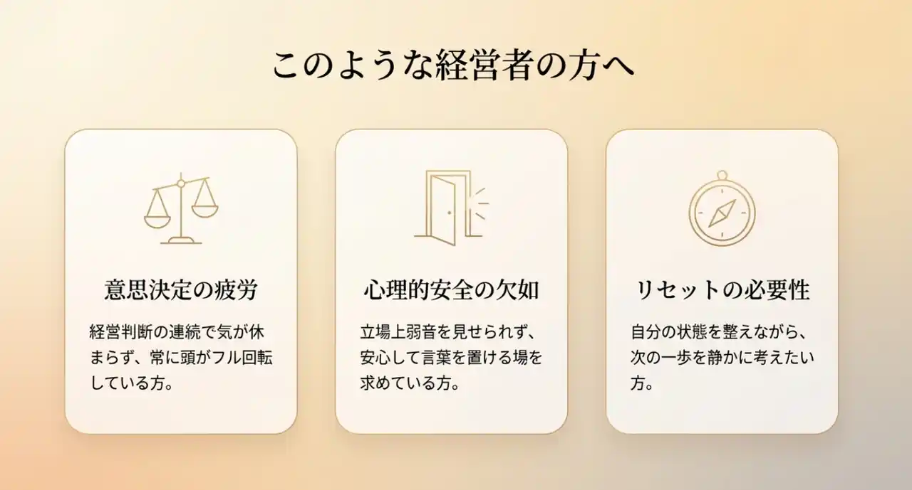 特に、 経営判断の連続で気が休まらない方 安心して話せる場を求めている方 自分の状態を整えながら次の一歩を考えたい方 にとって、有効な時間となることを目指しています。 |