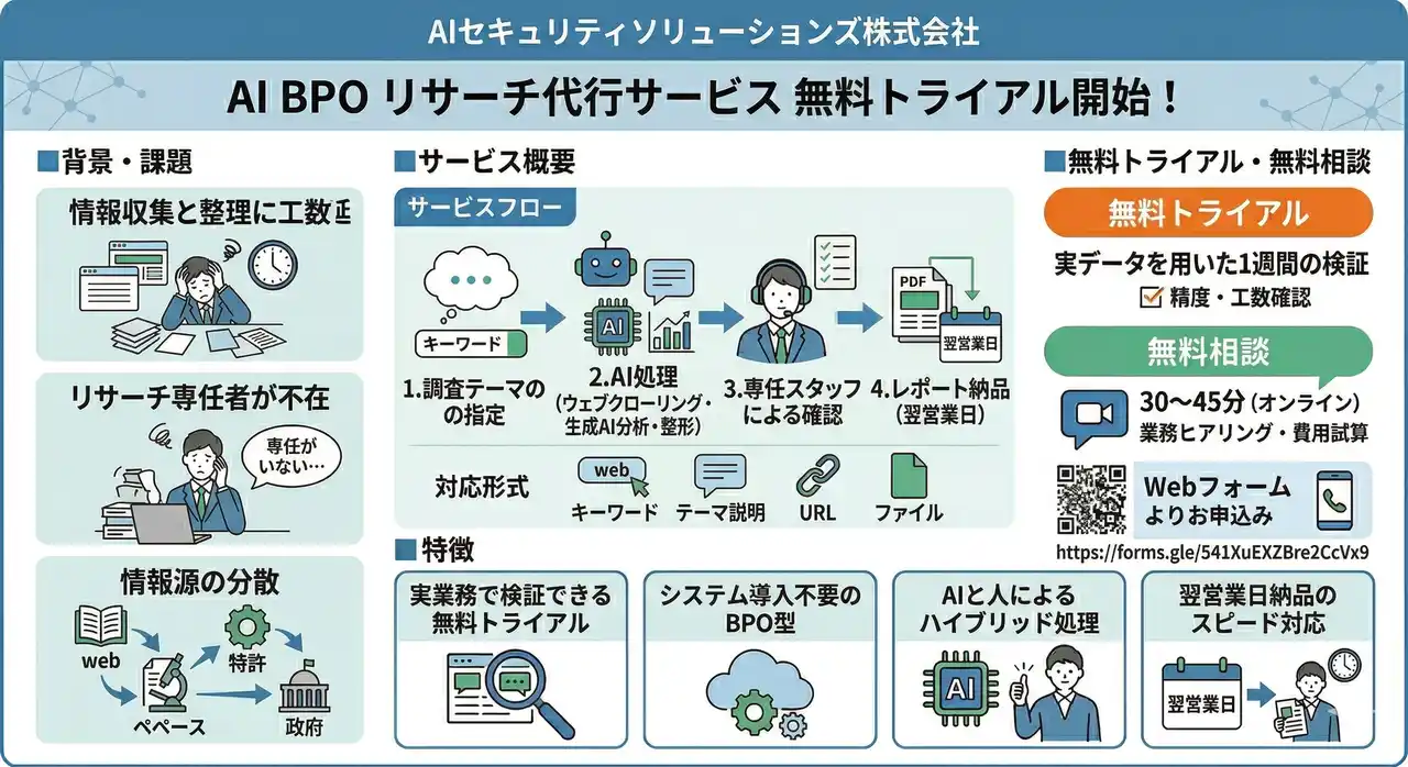 AIセキュリティソリューションズ株式会社(本社:東京都、以下当社)は、市場調査・競合分析・情報収集業務を代行する「AI BPOリサーチ代行サービス」について、本日より無料トライアルおよび無料相談の提供を開始しました。