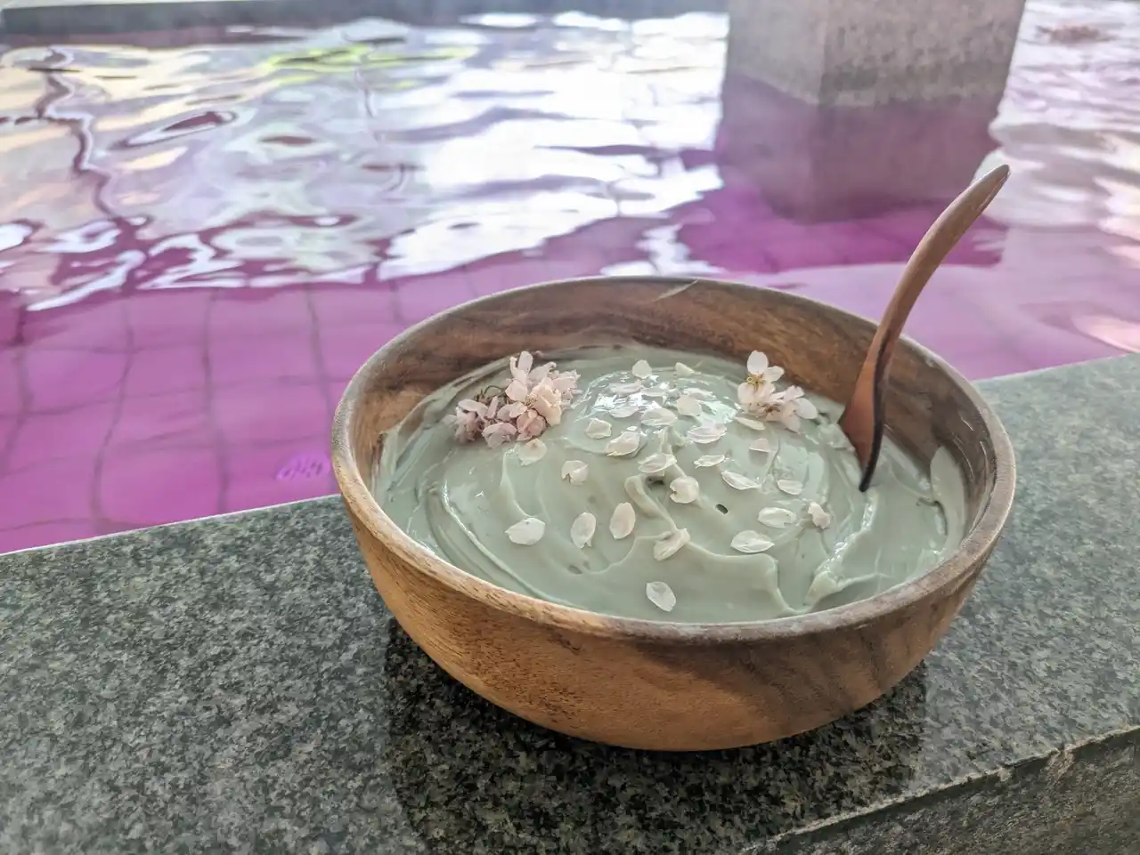 浴室に、香りと色で「芝桜」をイメージした泥パックを設置します。 |