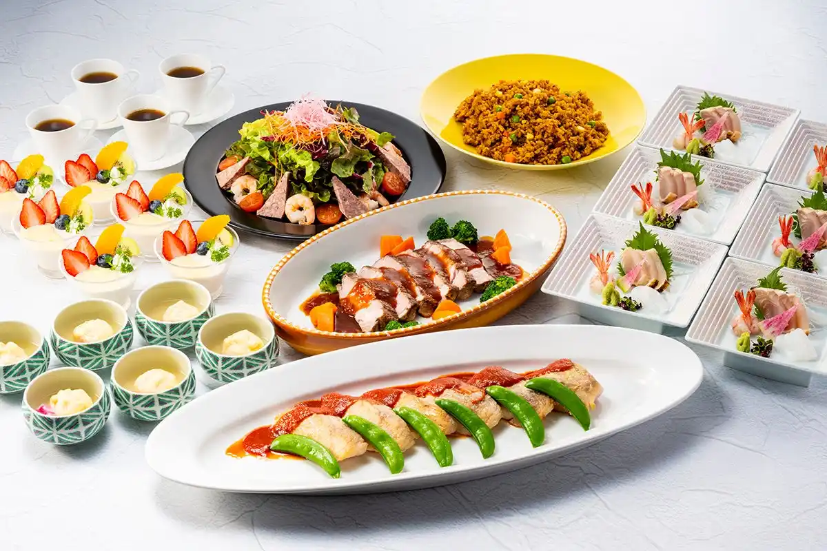 スタンダードプラン:サラダ、お造り盛り合わせ、白身魚のムニエル トマトソース、季節の蒸し物、厚切り豚肩ロースのステーキ BBQソース、ドライカレー、デザート、コーヒー |