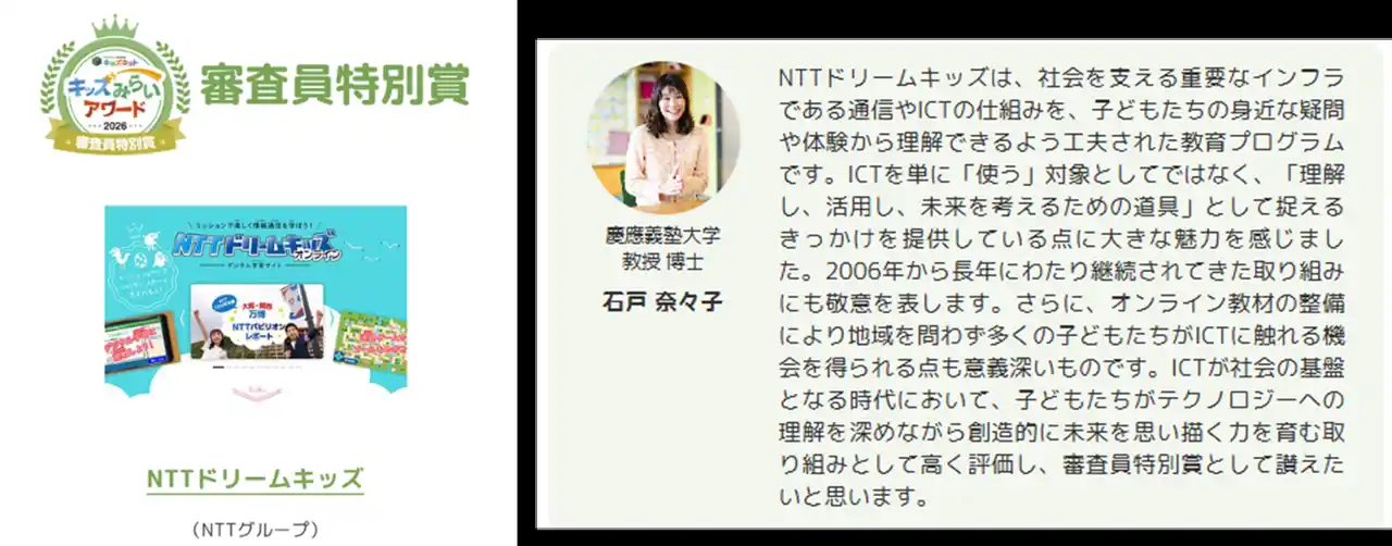 審査員特別賞(慶應義塾大学教授博士 石戸奈々子) NTTグループ「NTTドリームキッズ」 |