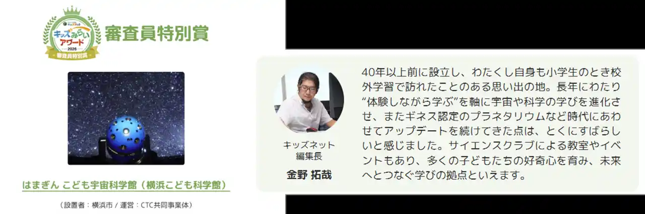 審査員特別賞(キッズネット編集長 金野拓哉) 設営者:横浜市 運営:CTC共同事業体「はまぎん こども宇宙科学館(横浜こども科学館)」 |