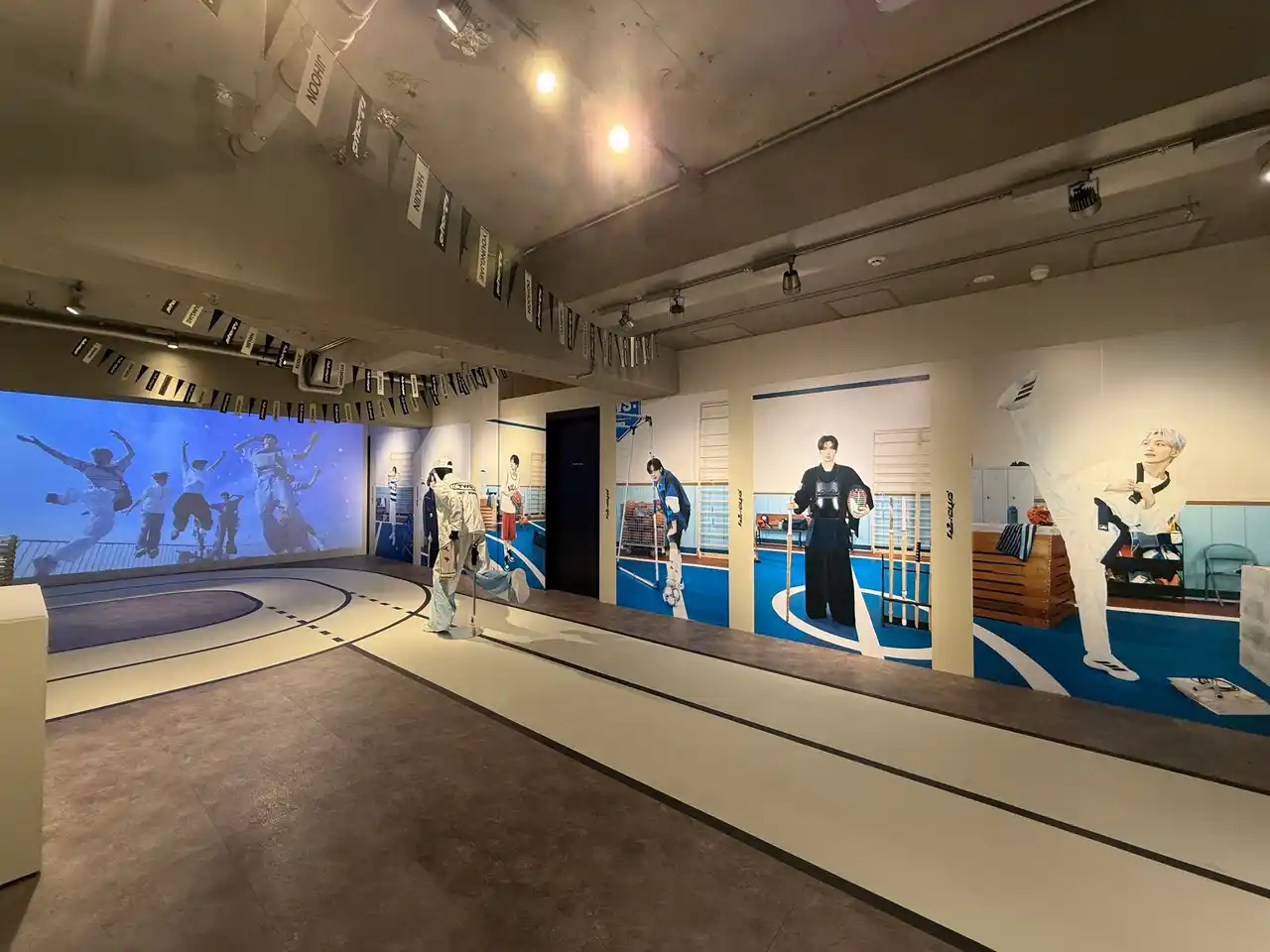 STOREはファンミーティングのイメージを踏襲し、運動部を連想させるような装飾になっています。会場を入ると床にはトラックのような装飾が床に施されており、来場者もまるで運動部の一員になったかのような気分を体験できます。会場を入ると、右側には様々な種目をするメンバーの写真が見えます。SHINYUはテニス、DOHOONはサッカー、YOUNGJAEは剣道、HANJINは射撃、JIHOONはテコンドー、KYUNGMINはバスケットボールをやっているような躍動感溢れる写真が大きく掲示されています。