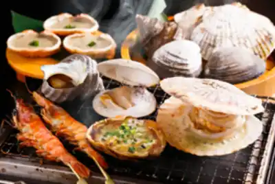 水槽から引き揚げたばかりの活貝や、一番人気の蟹味噌甲羅焼や魚介を目の前で焼きながら楽しめます。新鮮なお刺身や一品料理もご用意しております。丼ぶりや定食も充実した女性のお客様にも人気のお店です!一部店舗でランチ販売やデリバリー、テイクアウトも実施しております。 |