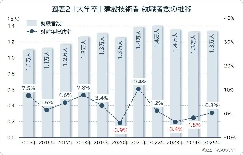 就職者の約6割を占め、新卒採用の中心である大学(学部)卒での建設技術者就職者数は、2025年に前年比0.3%増え、約1.3万人となりました。2年連続の減少から増加に転じたものの、増加幅は限定的であり、大きな回復には至っていません。 |