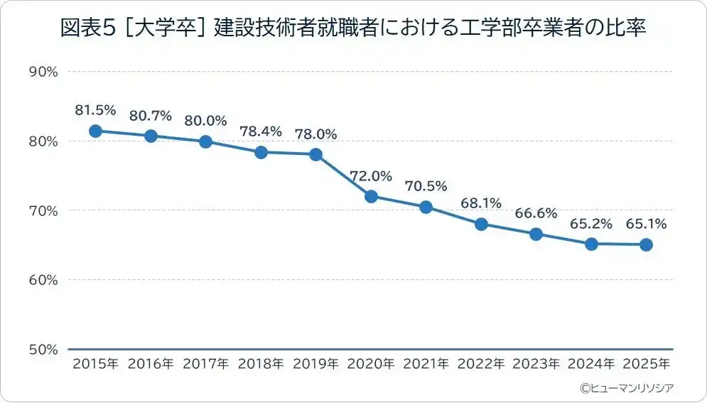 また女性の建設技術者就職者数は増加傾向にあり、大学卒の就職者に占める女性比率は2025年時点で24.8%と、就職者の約4分の1を女性が占めています。大学の学部別就職者では、土木建築工学などを含む工学部出身者が占める割合が継続して低下しており、2025年には65.1%となりました。 |
