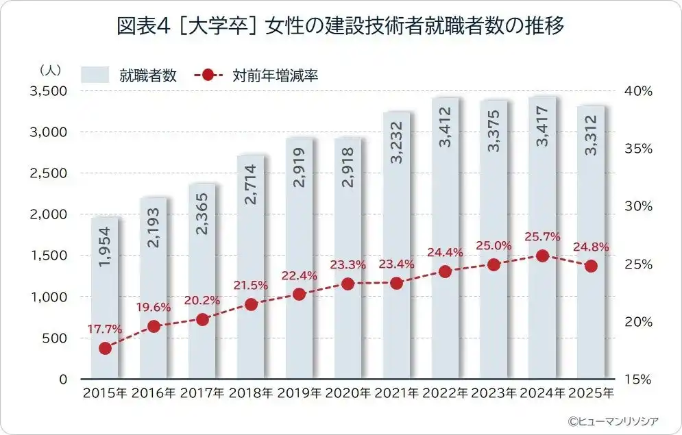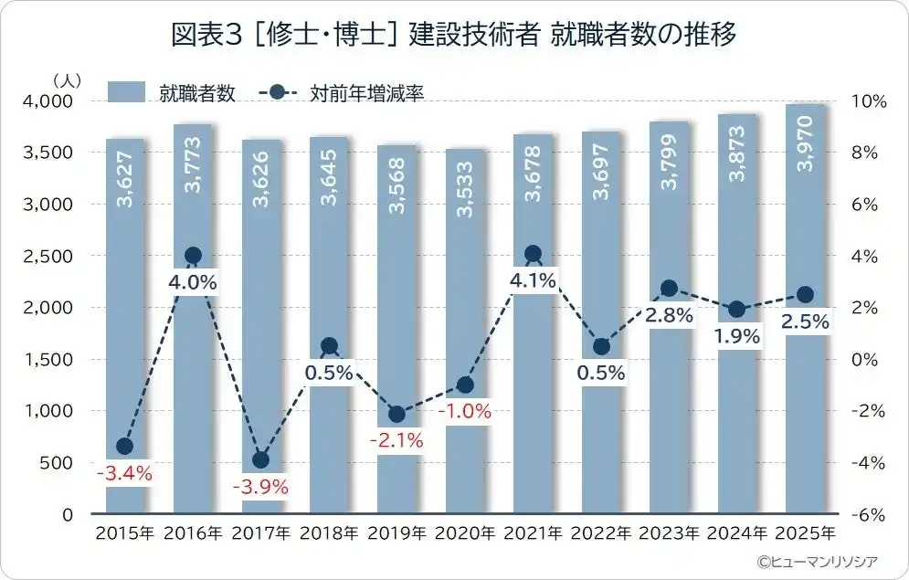 大学院(修士・博士)を修了し、建設技術者として新卒で就職した人数は、前年比2.5%増で、5年連続で増加しています。人数ベースでは3,970人と少ないものの、建設技術の高度化を背景に、より専門性の高い人材への需要が高まっていると考えられます。 |