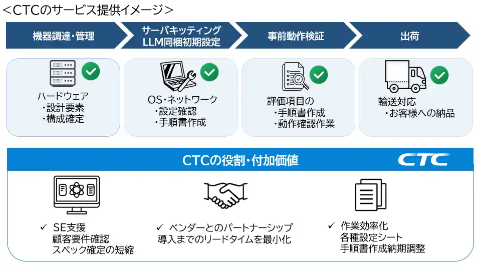 CTCは、長年のSI実績とインフラ構築で培ったノウハウを基に、本ソリューションの導入プロセス最適化を支援します。また、ベンダーとのパートナーシップを活かし、導入までのリードタイムを最小化します。さらに、各種設定シートや手順書の整備、出荷前の動作検証、出荷・輸送管理までを一括して対応することで、現場作業の負荷を大幅に軽減します。 |