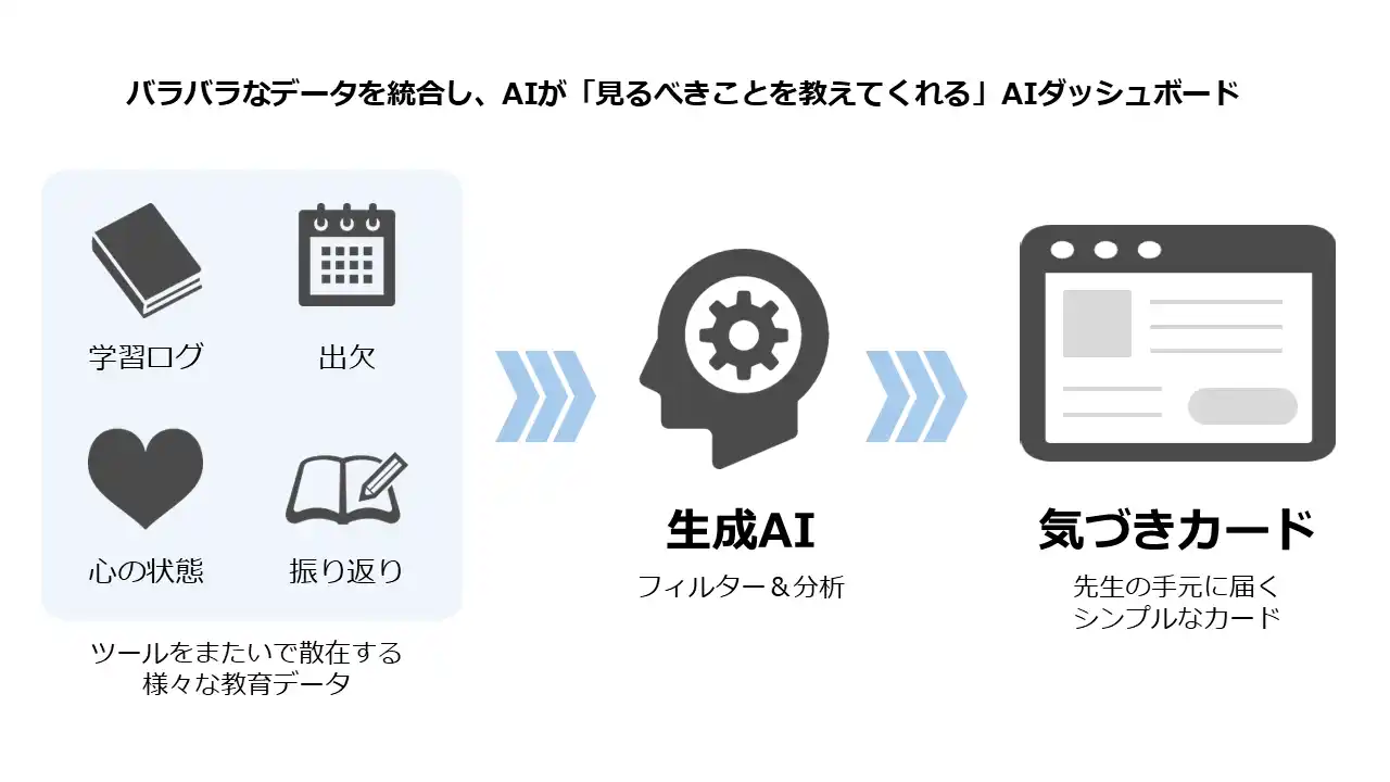 本サービスは、ツールをまたいで散在する様々な教育データを統合し可視化するだけにとどまらず、生成AIがデータを分析し「何に注目すべきか」の提示まで行うことで、教員が「気づき」を得て、「次の行動」につなげることを狙いとして設計しています。具体的には、生成AIが児童生徒に注意の必要な状況を検知すると「気づきカード」として提示します。教員は必要に応じて詳細画面からグラフやデータで内容を確認したり、「AIチャット」でAIに質問や相談をしたりすることで、状況の深掘りを行うことができます。出席日数や成績の変動といった客観的な数字データだけでなく、児童生徒の心の状態や学習の振り返りといった主観的なデータも重視し、複合的な要因から「気づき」を提示します。 |
