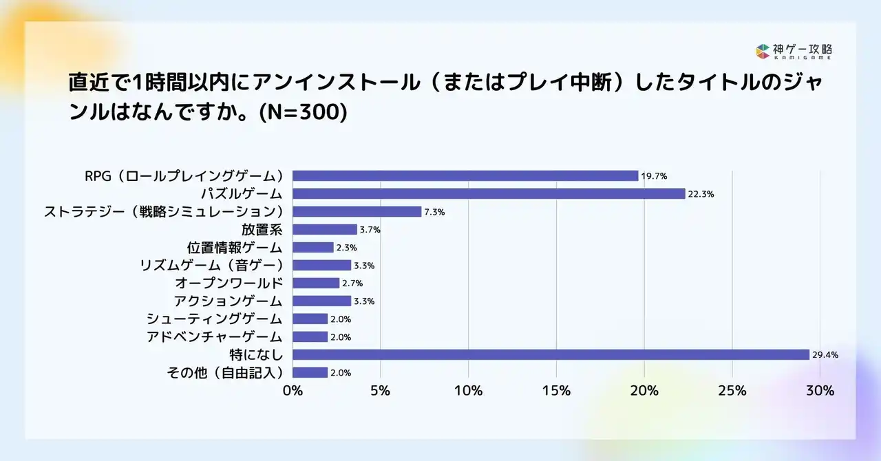 | 直近で1時間以内に離脱したタイトルのジャンルでは、「パズルゲーム(22.3%)」と「RPG(19.7%)」が上位を占め、3位の「ストラテジー(7.3%)」とは一定の差が見られました。 | |||